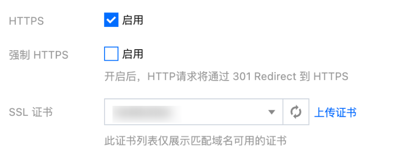 启用后,您需要从 SSL 证书服务选择与该域名匹配的证书,即可完成配置。如果证书下拉列表为空,说明您尚未在 SSL 证书服务拥有与该域名匹配的证书,可先前往 SSL 证书服务完成证书的上传或购买。