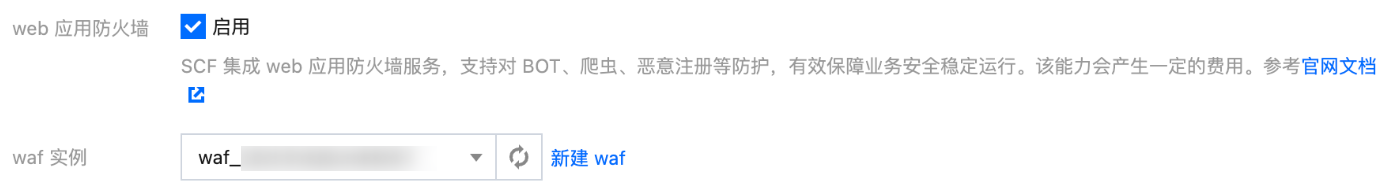 4. 购买完成后,返回云函数控制台,在自定义域名配置页面,勾选 Web 应用防火墙启用,在 WAF 实例的下拉列表中选择对应的实例 ID。