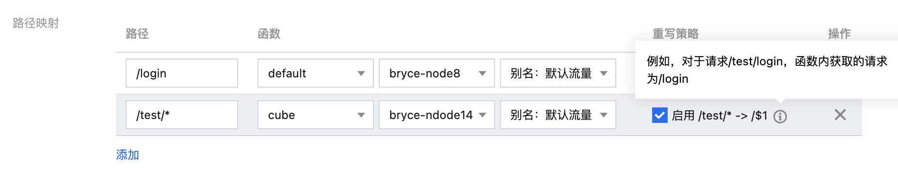 假设,设置路径为 /xxx/*,对应命名空间为 n2,对应函数为 f2,对应版本为1。那么路径前缀为 /login/(例如 /xxx/a、/xxx/b/c/d)的请求都会触发版本1下的 f2 函数执行。