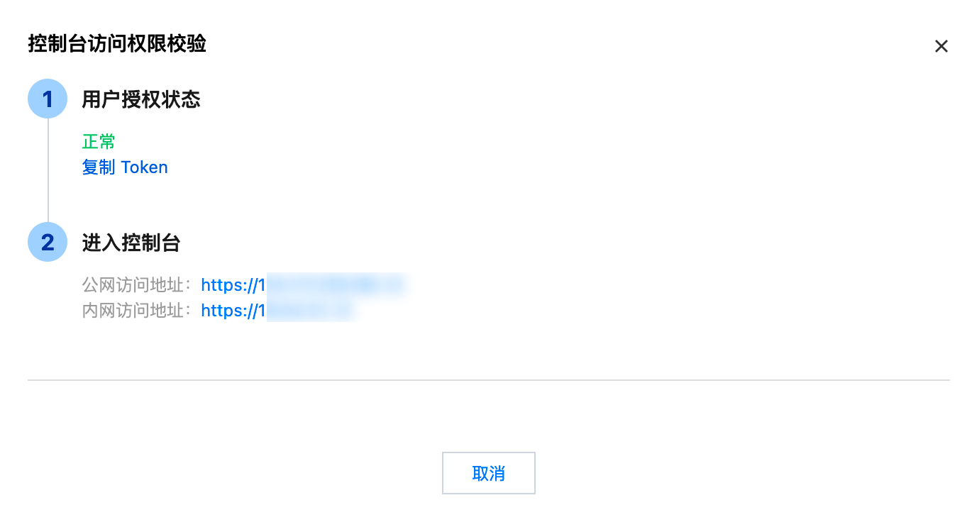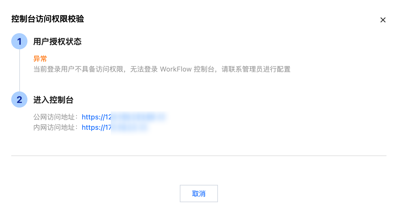 3. 在控制台访问权限校验中,单击登录链接,平台将对该用户的授权状态进行校验,权限缺失时,会进行对应提示。如下图所示: