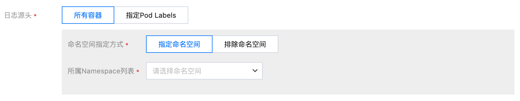 日志源支持所有容器、指定 Pod Labels 。如下图所示: