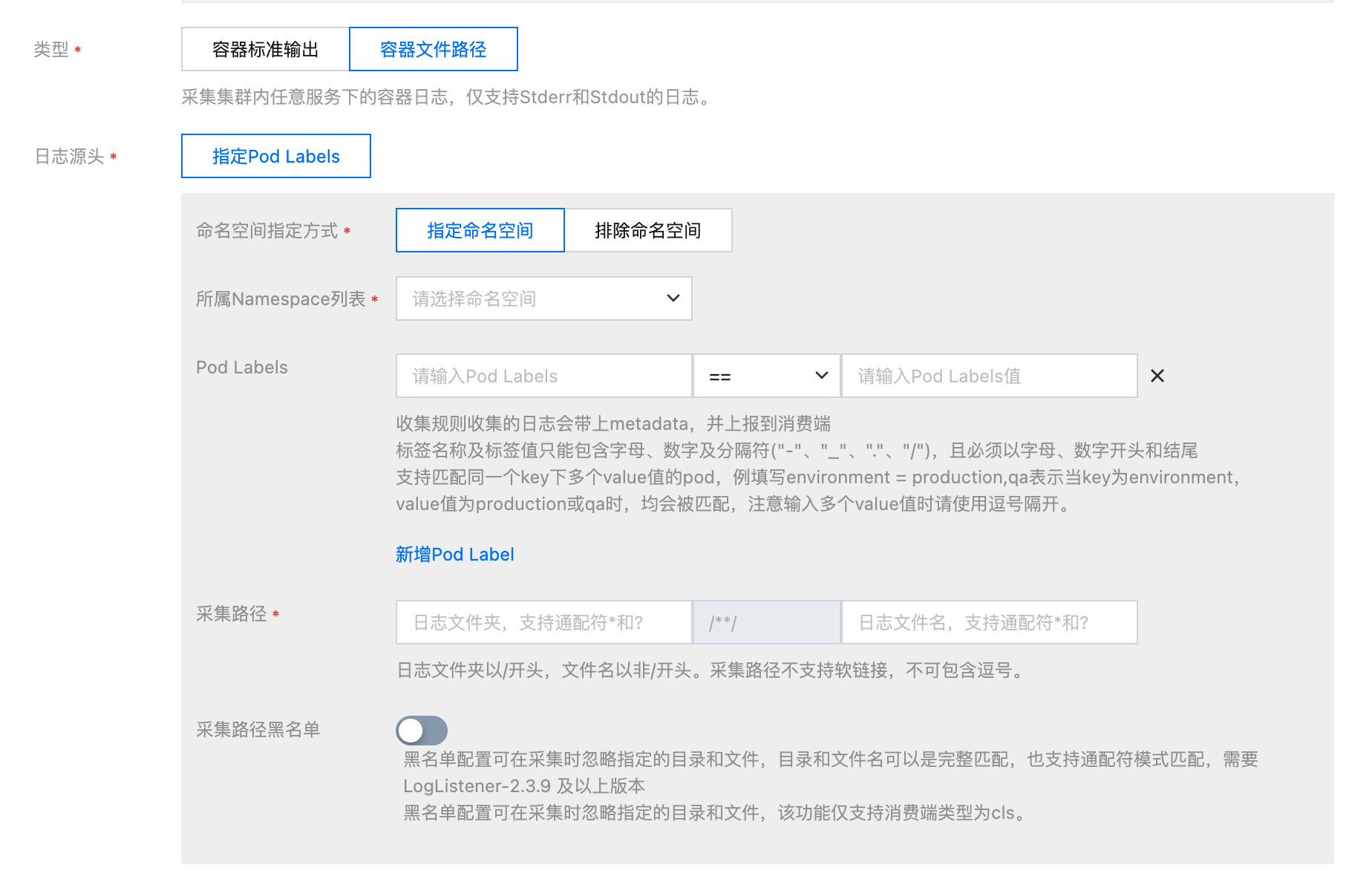 Pod Label:新增需匹配的 Pod 标签,默认采集符合此 Label的全部容器。