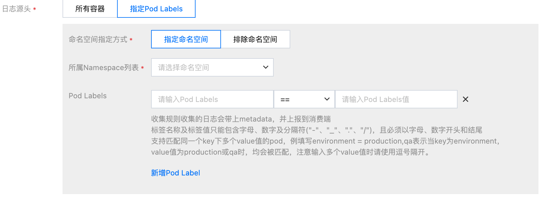 日志源支持指定 Pod Labels。