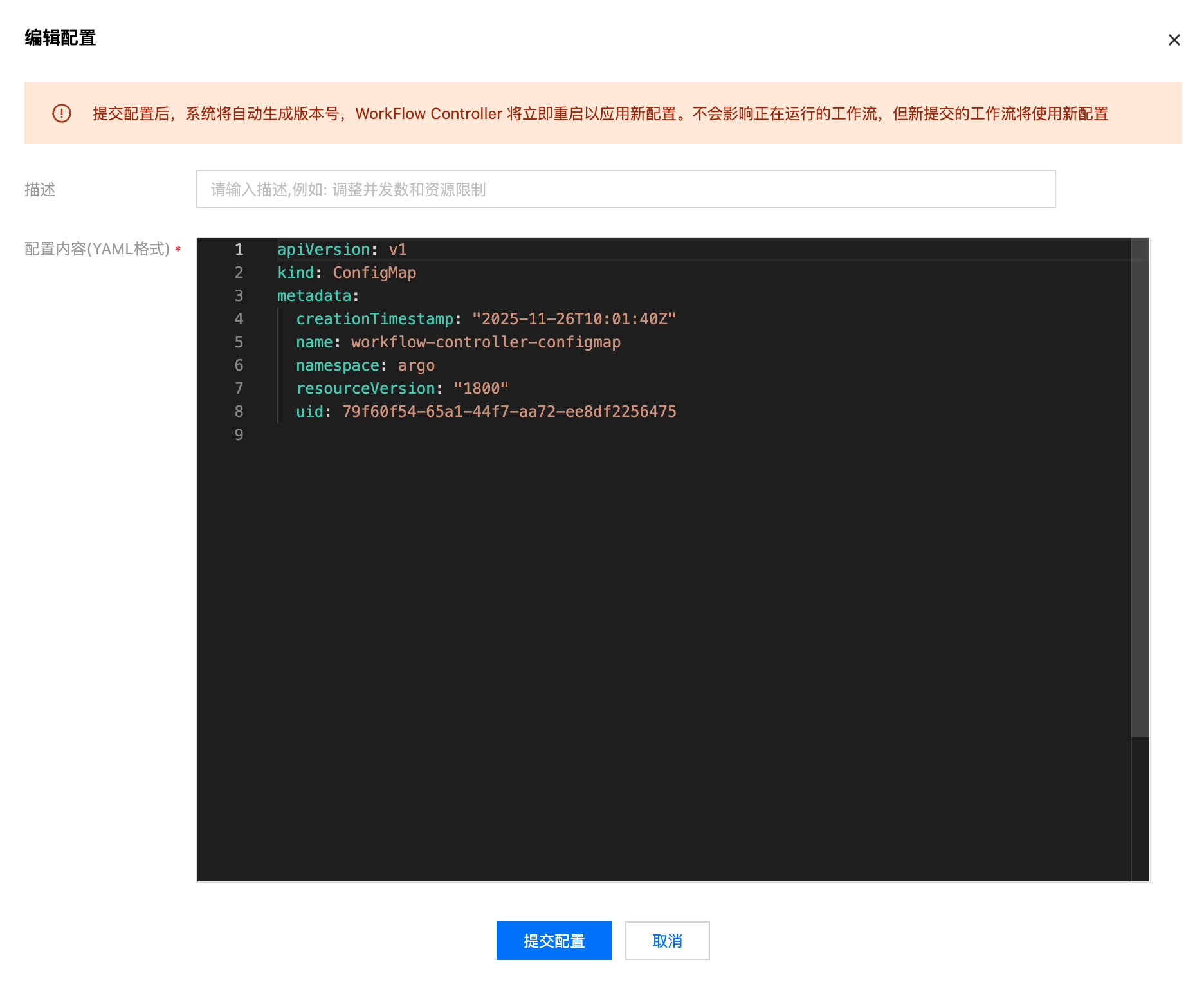 workflow-controller-configmap,单击编辑配置。如下图所示: