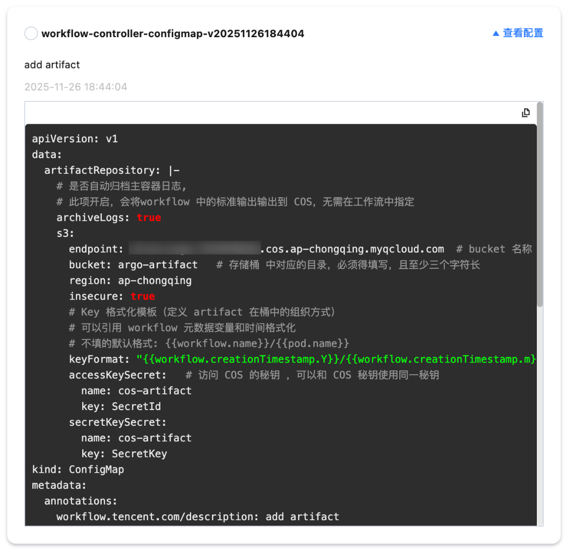 workflow-controller-configmap,实现配置 Artifacts、工作流状态持久化归档等开源 Argo WorkFlow 支持的原生能力。操作步骤