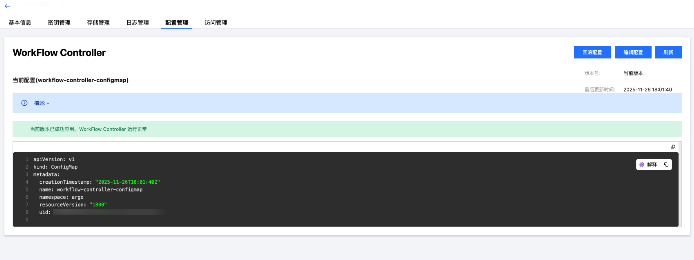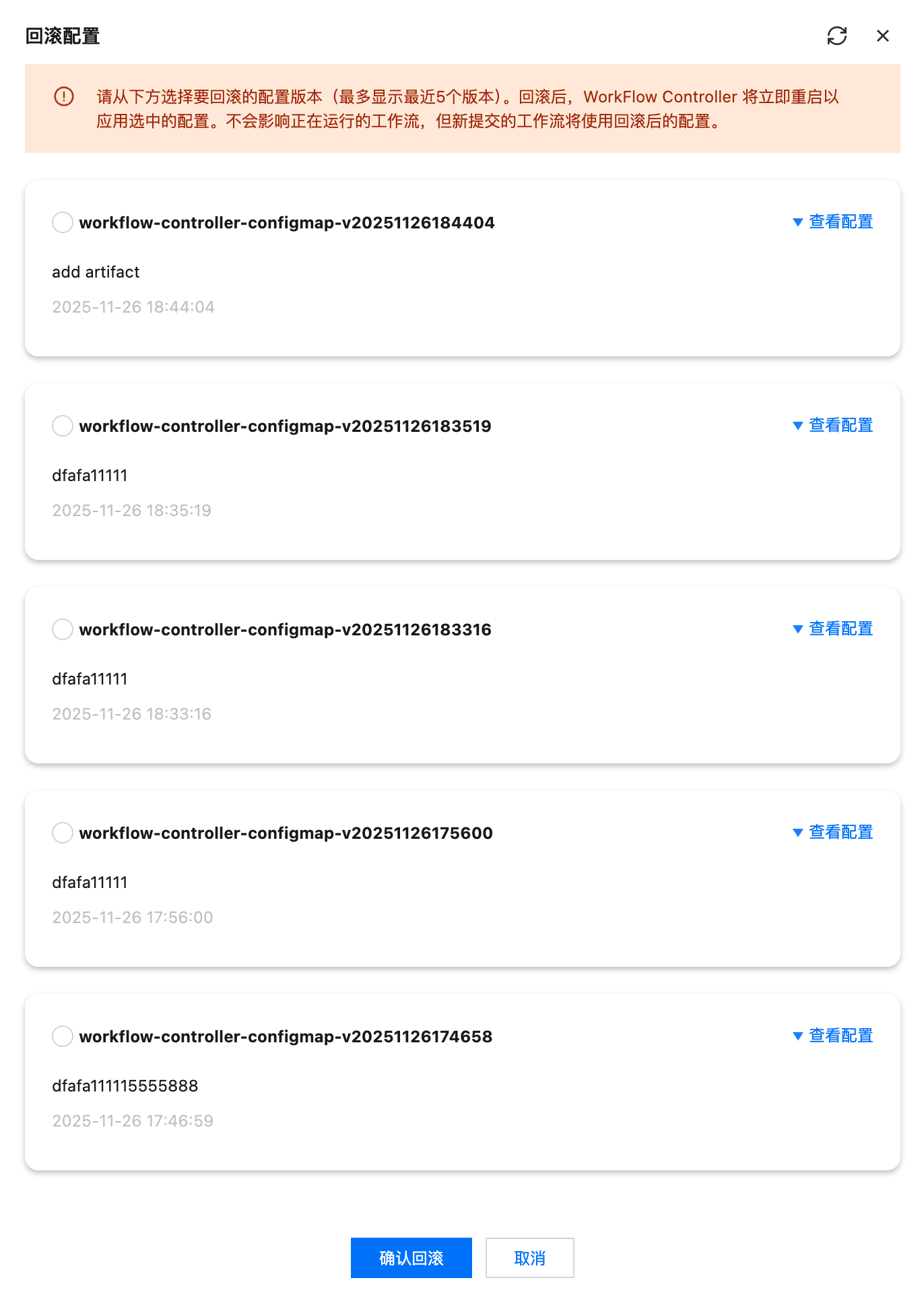 回滚后,WorkFlow Controller 将立即重启以应用选中的配置。不会影响正在运行的工作流,但新提交的工作流将使用回滚后的配置。
