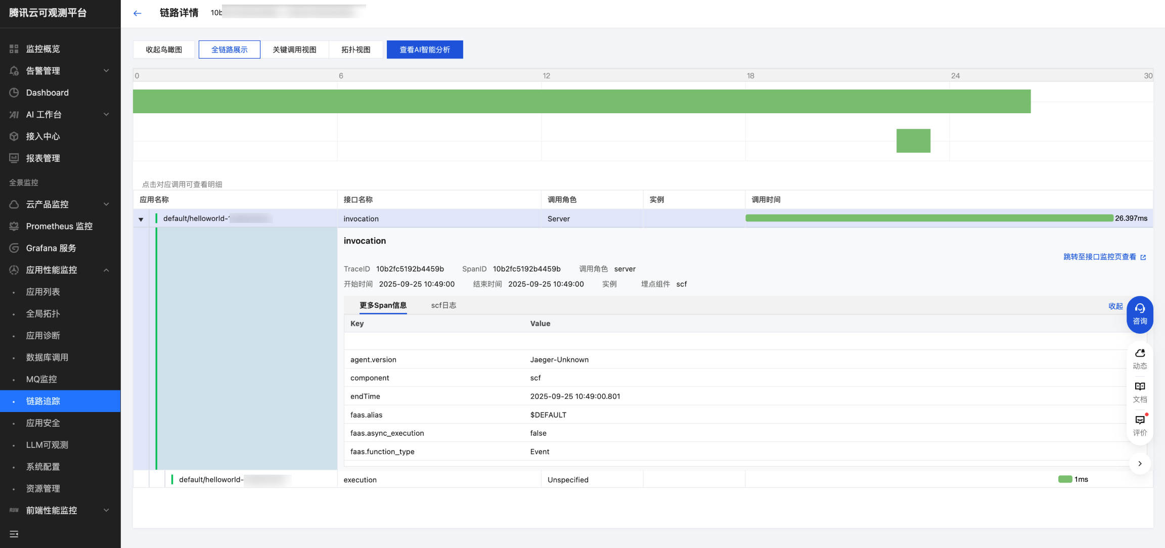 腾讯云云函数与 APM 集成,将可观测性的重点从单个系统转为整体系统。在 Serverless 场景下,即从对单个函数的观测转为对 Serverless 应用(包含多个函数及其他服务)的观测,通过丰富的指标监控采集分析、依赖拓扑图、调用链分析、日志分析等能力,为开发者全面的展示整个应用的运行情况。