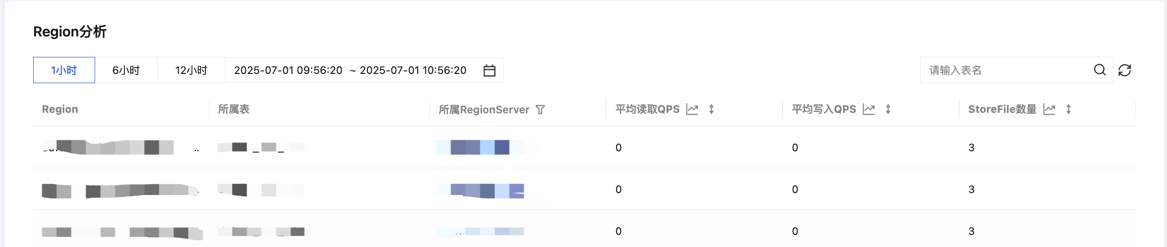 数据表分析提供 Hbase 表级、表内 Regions、Regionservers 的读写请求量和存储情况等维度信息;同时提供 Region 分析,结合实际场景支持对所属表或所属 RegionServer 分析读取 QPS、写入 QPS 信息及历史变化趋势。