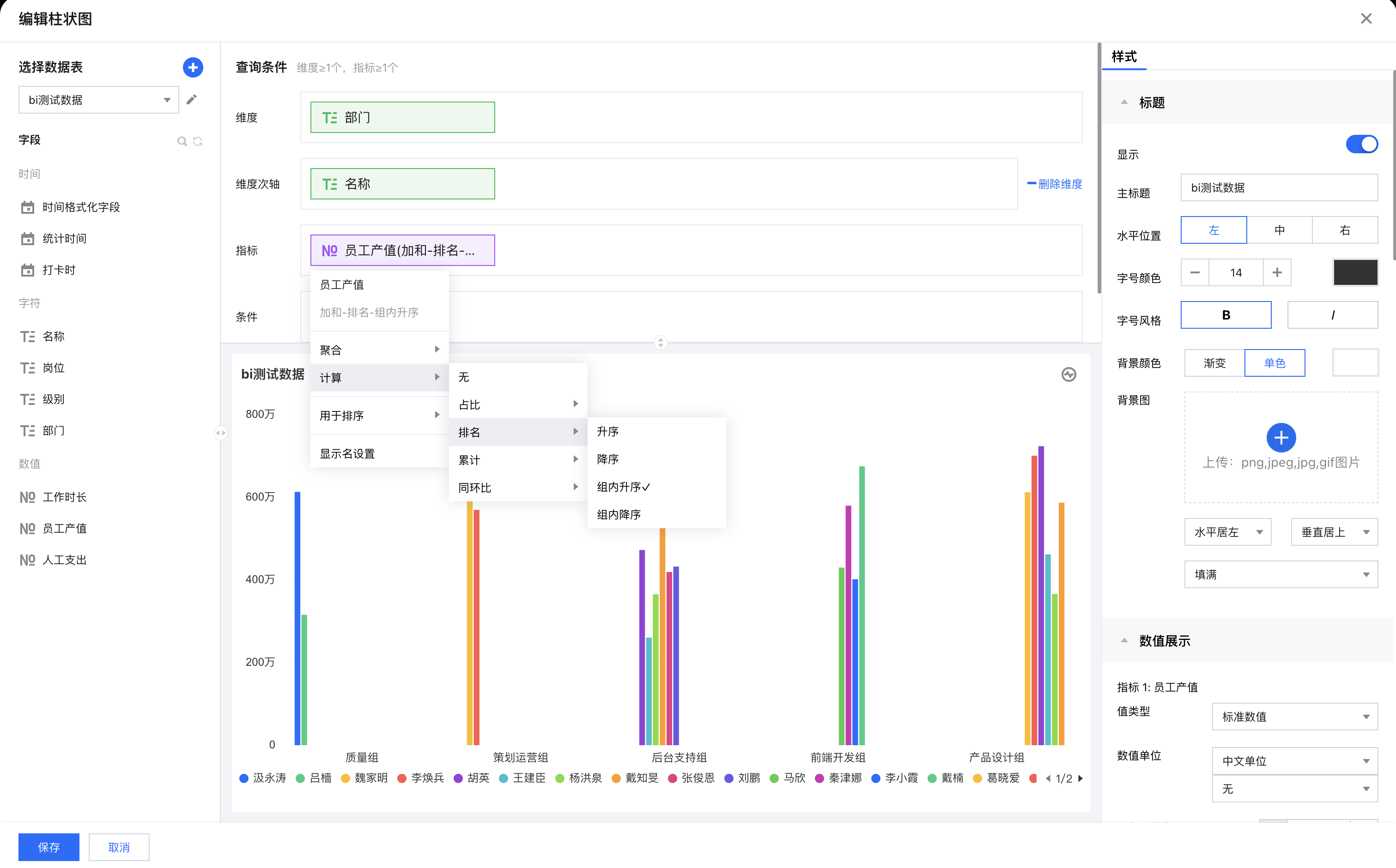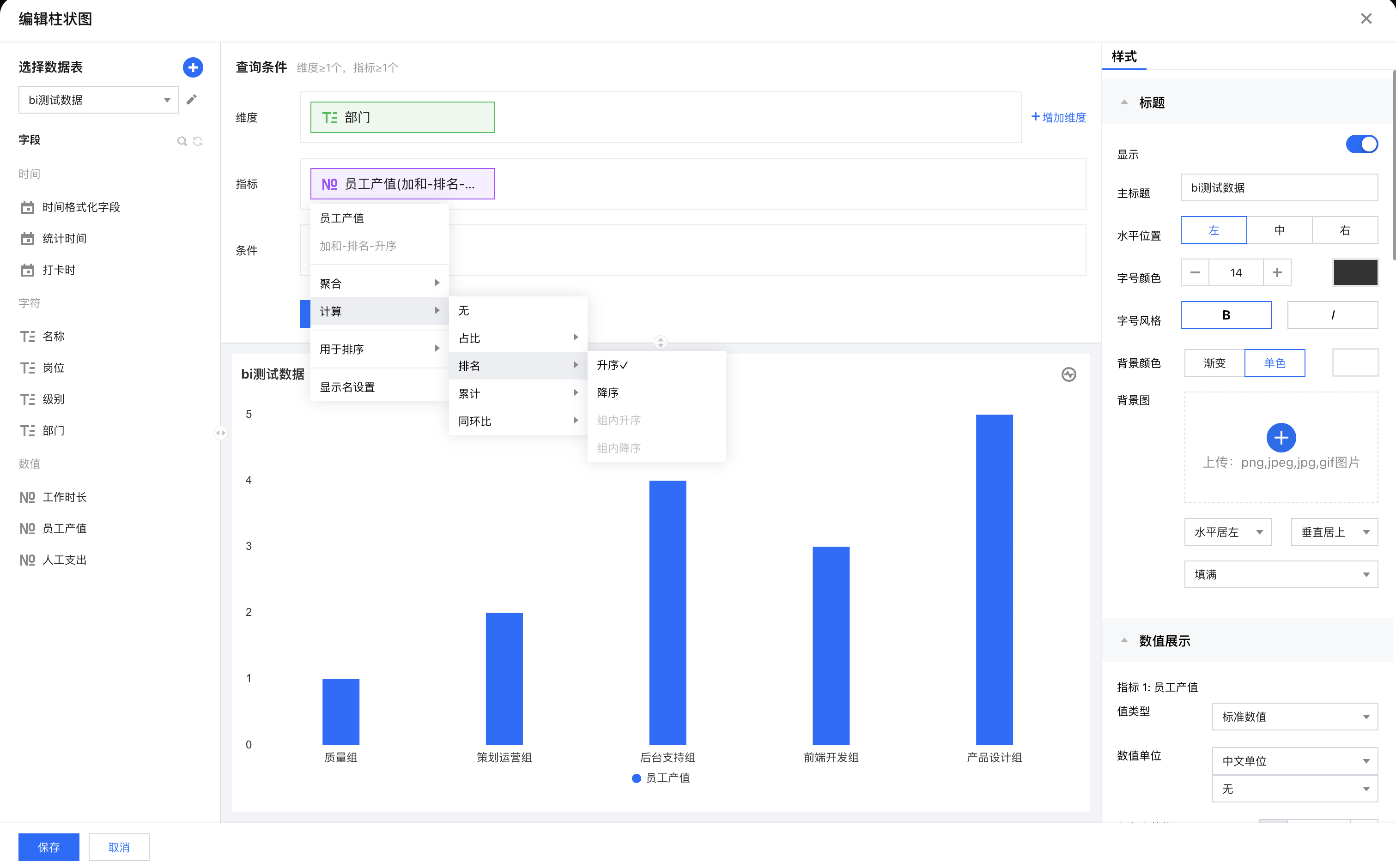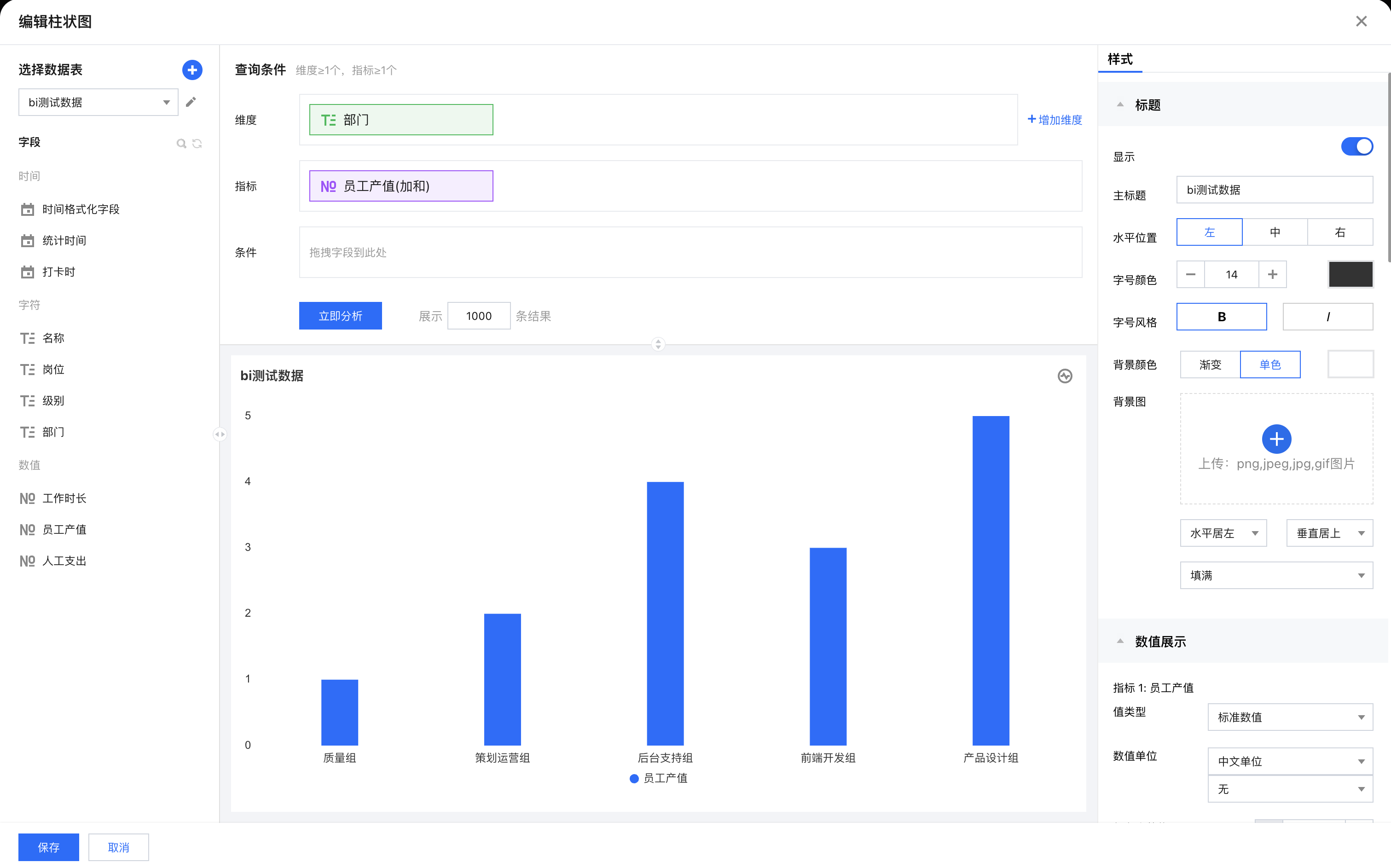1. 进入画布,添加柱图组件,设置维度为“部门”,次轴“员工”,指标为“员工产值”。