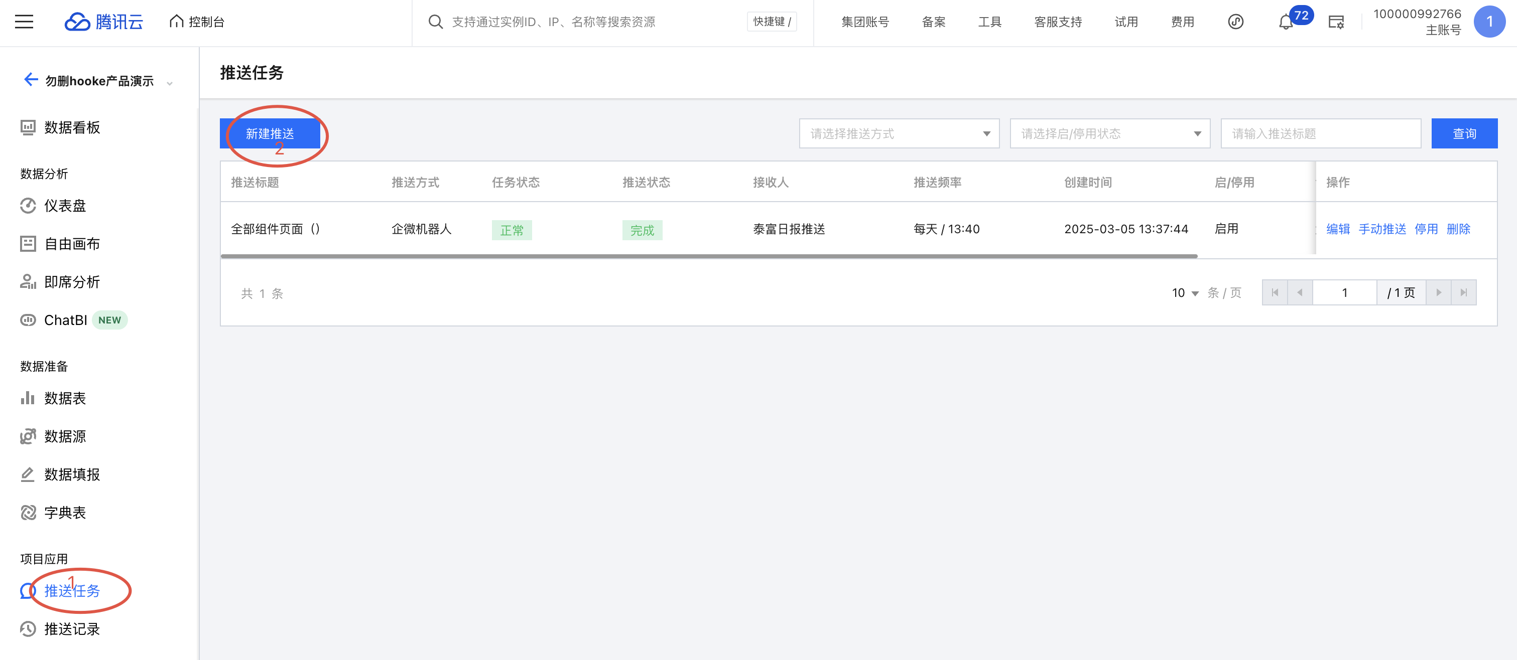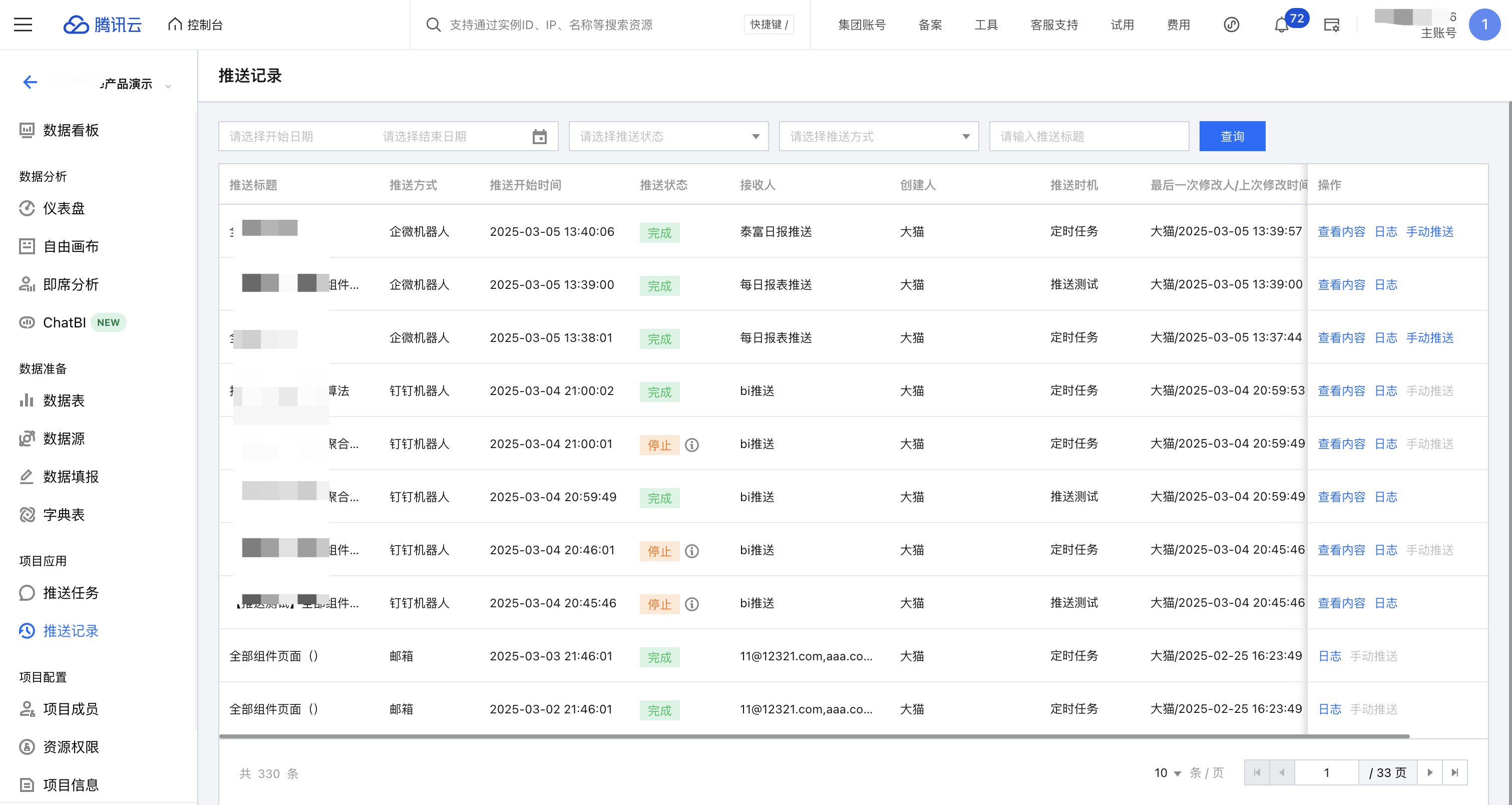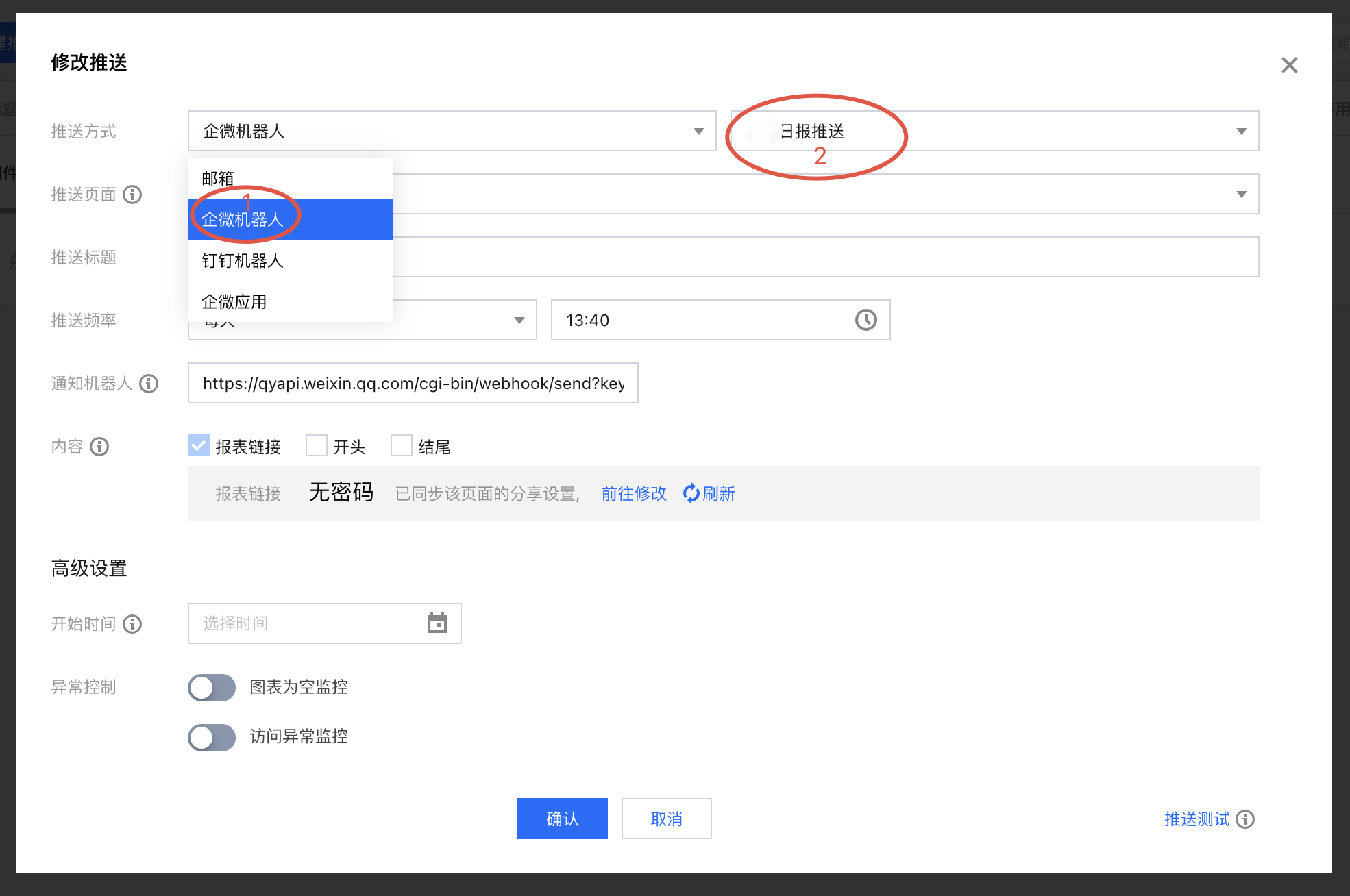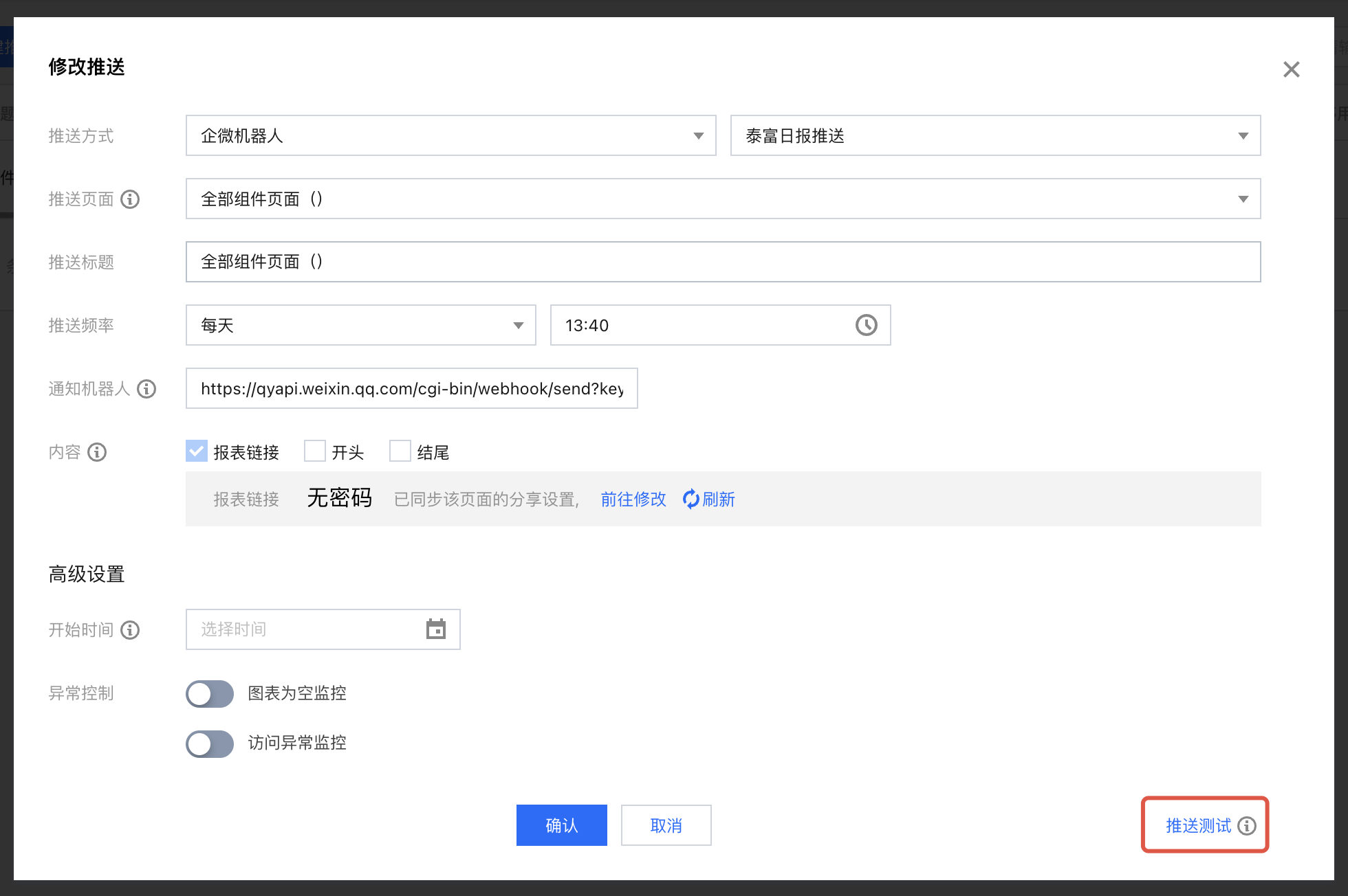 报表制作完成后,您可以根据需要定制推送计划,通过机器人(webhook)推送获取定期的报告。