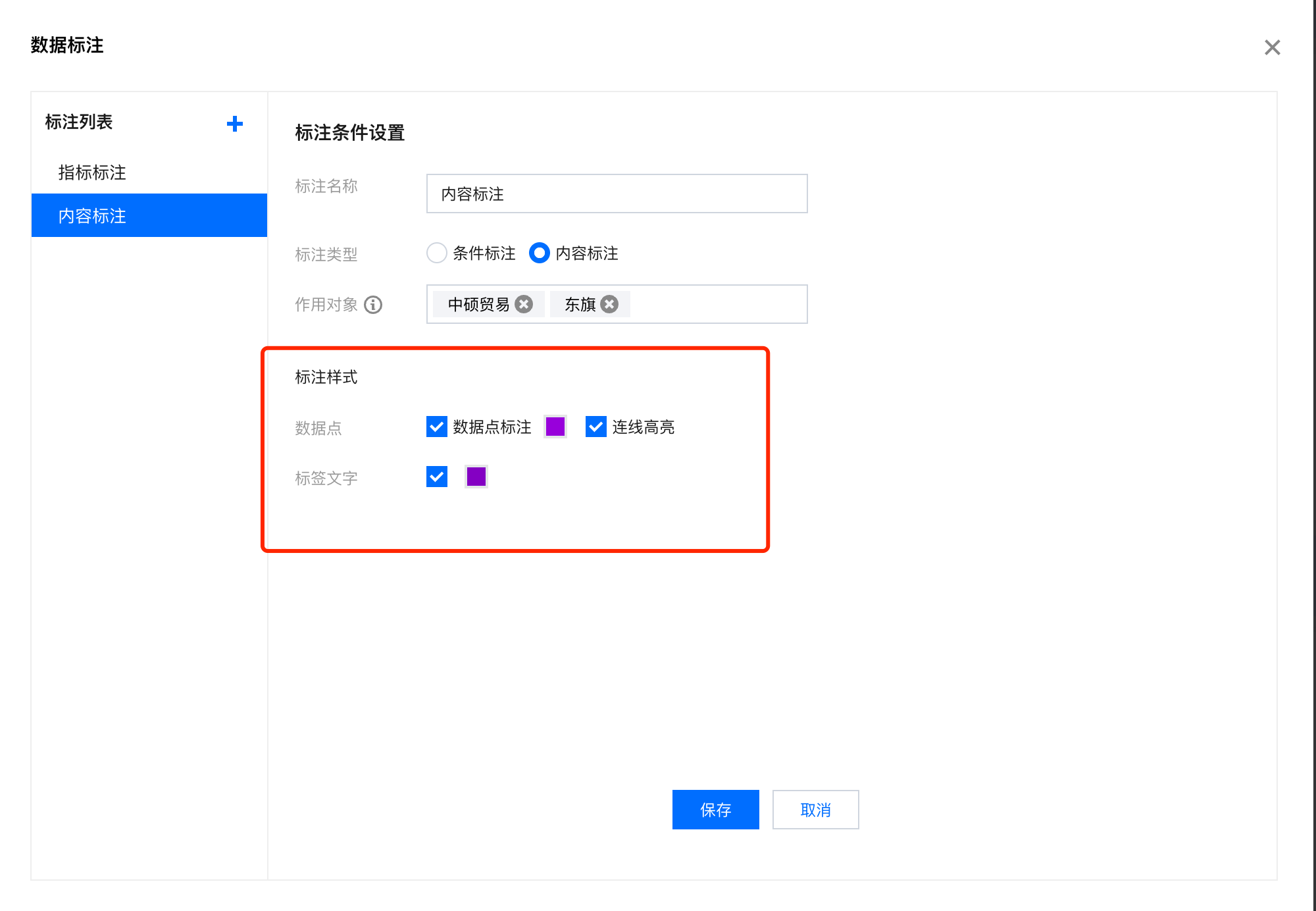 2. 标注类型选择内容标注,点击作用对象选择中硕贸易和东旗。在标注样式中,勾选数据点标注和连线高亮,并将颜色设置为紫色,勾选标签文字并设置颜色。
