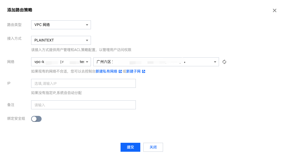 选择 SASL_PLAINTEXT 接入方式的路由有且仅可以有一条,例如路由类型为公网域名接入选择了SASL_PLAINTEXT接入方式,则创建 VPC 路由时不可以再选择 SASL_PLAINTEXT 接入方式。