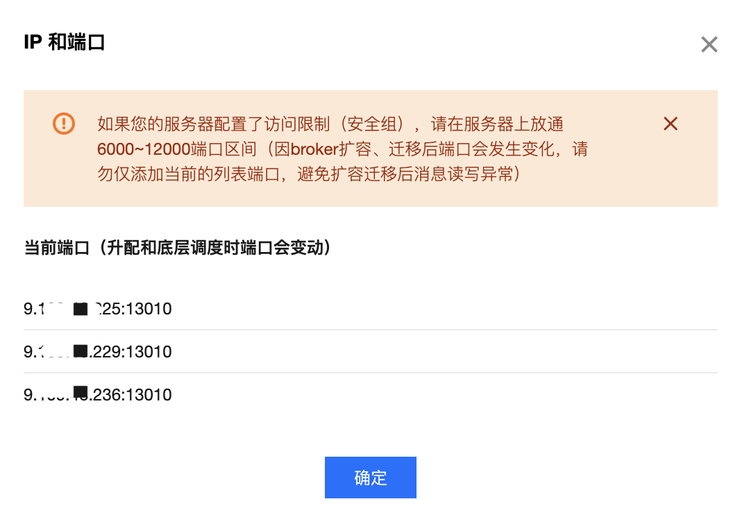 如果您的服务器配置了访问限制(安全组),请在服务器上放通50000 - 53000端口区间。因集群变配、迁移后端口会发生变化,所以请勿仅添加当前列表的 IP 及端口,避免变配迁移后的业务异常。