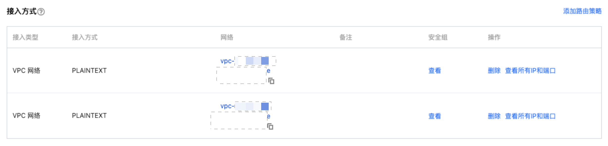 5. 单击提交,完成 VPC 网络添加,在网络列您可以获取接入点信息,用于连接集群进行消息生产消费。