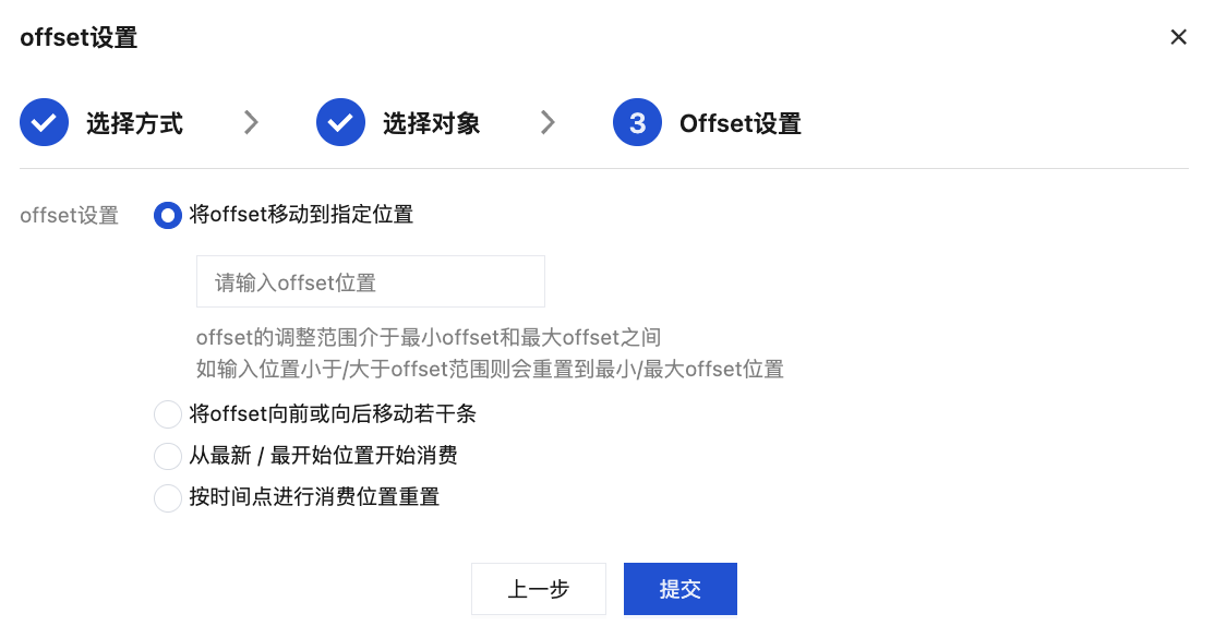 将 offset 移动到指定位置:将消费位点精确调整到指定的 offset 位置。offset 的调整范围介于最小 offset 和最大 offset 之间,如输入位置小于/大于 offset 范围则会重置到最小/最大 offset 位置。