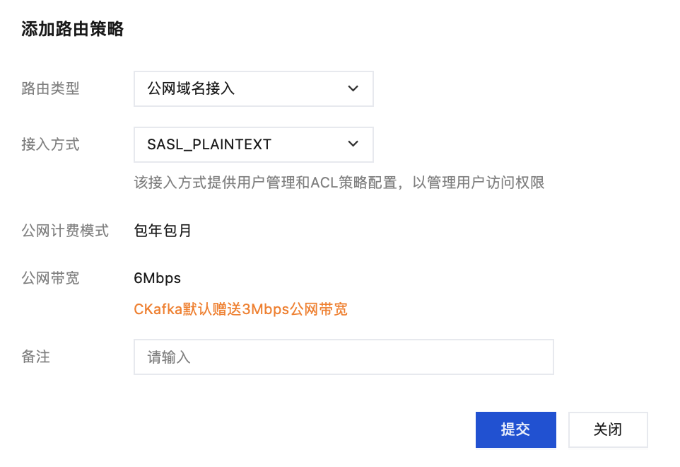 4. 在弹窗中,路由类型选择 公网域名接入,接入方式支持 SASL_PLAINTEXT 和 SASL_SSL,填写备注信息。