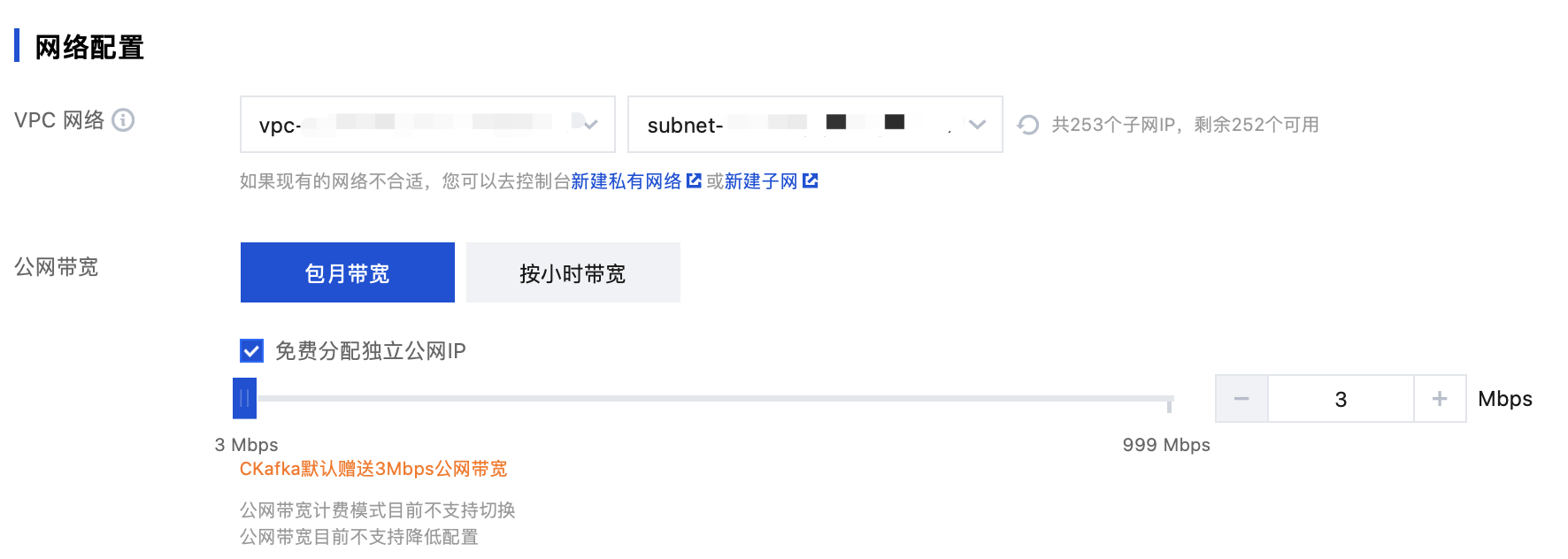 TDMQ CKafka 版当前默认提供 3Mbps 免费公网带宽,专业版实例支持升配公网带宽,若您有更高的带宽需求,可以额外支付费用购买。具体价格请参见 计费概述。公网带宽计费模式不会跟随实例计费模式转换。