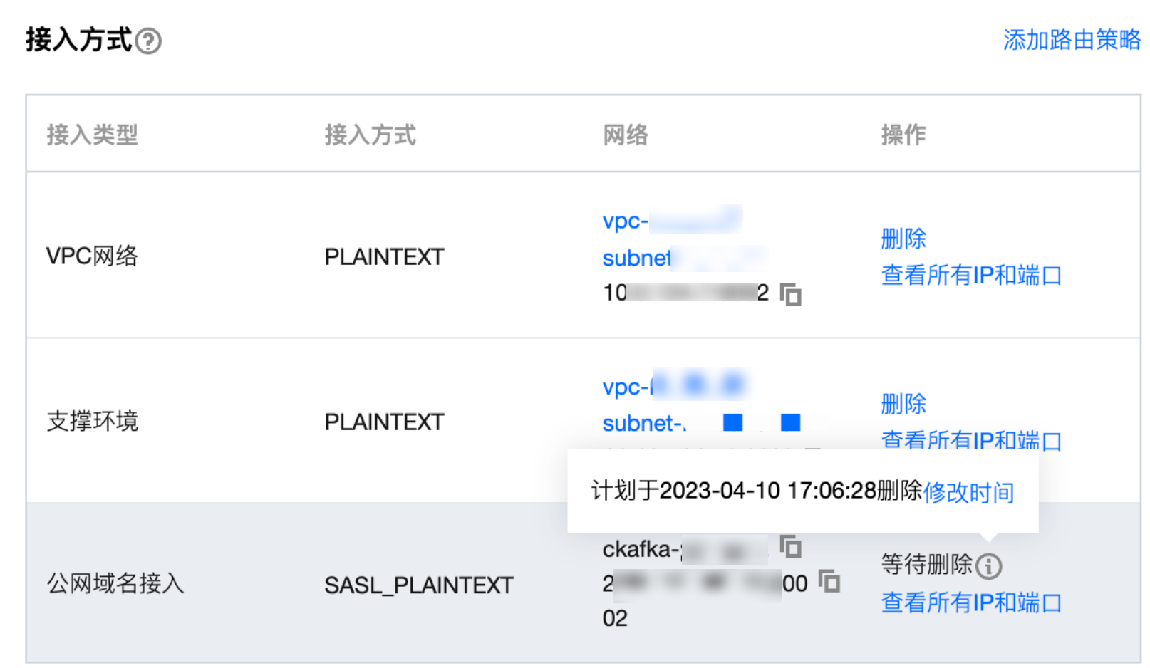 选择 SASL_PLAINTEXT 接入方式的路由有且仅可以有一条,例如路由类型为公网域名接入选择了SASL_PLAINTEXT接入方式,则创建 VPC 路由时不可以再选择 SASL_PLAINTEXT 接入方式。