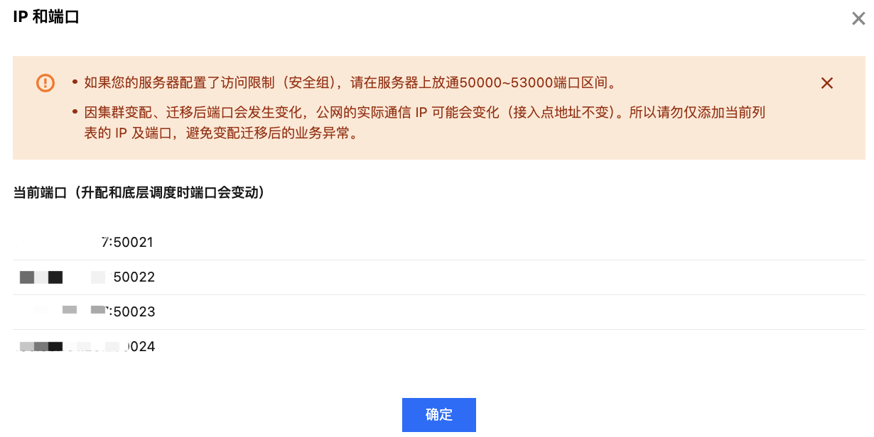 如果您的服务器配置了访问限制(安全组),请在服务器上放通50000 - 53000端口区间。因集群变配、迁移后端口会发生变化,公网的实际通信 IP 可能会变化(接入点地址不变),所以请勿仅添加当前列表的 IP 及端口,避免变配迁移后的业务异常。