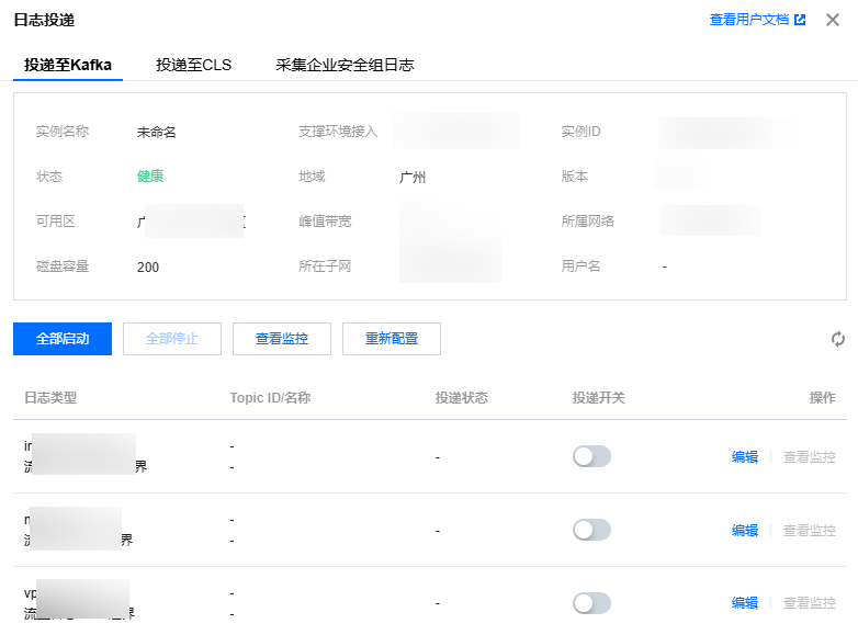 重新配置:在日志类型列表上方,单击重新配置,将会允许您重新选择投递的消息队列实例、网络接入方式以及用户名/密码。