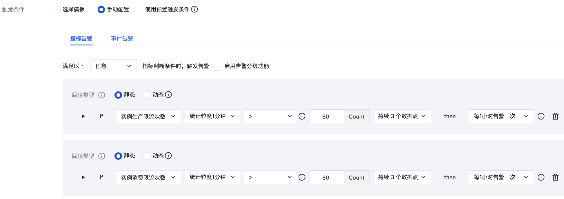 2. 用户可以打开监控数据查看流量的最大值,如果 (流量的最大值 × 副本数) > 购买时的峰值带宽,则表明至少发生过一次限流。可通过配置限流告警得知是否发生限流。告警规则等配置步骤请参考配置告警策略。