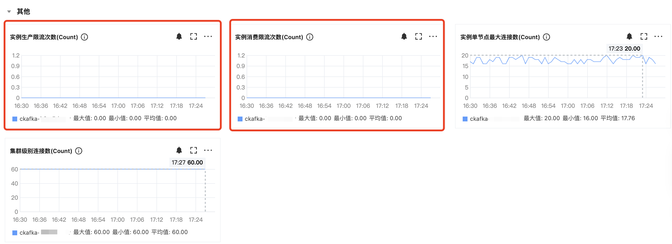 CKafka 的实例限流次数统计的是各个节点限流次数之和,并不代表整个实例的写入和消费性能,也不代表所有节点都触发了限流,因此当出现限流次数,但是限流流量整体看低于规格值,客户可以在高级监控中,查看各个节点的限流次数的统计,用于判断是哪个节点出现了限流。
