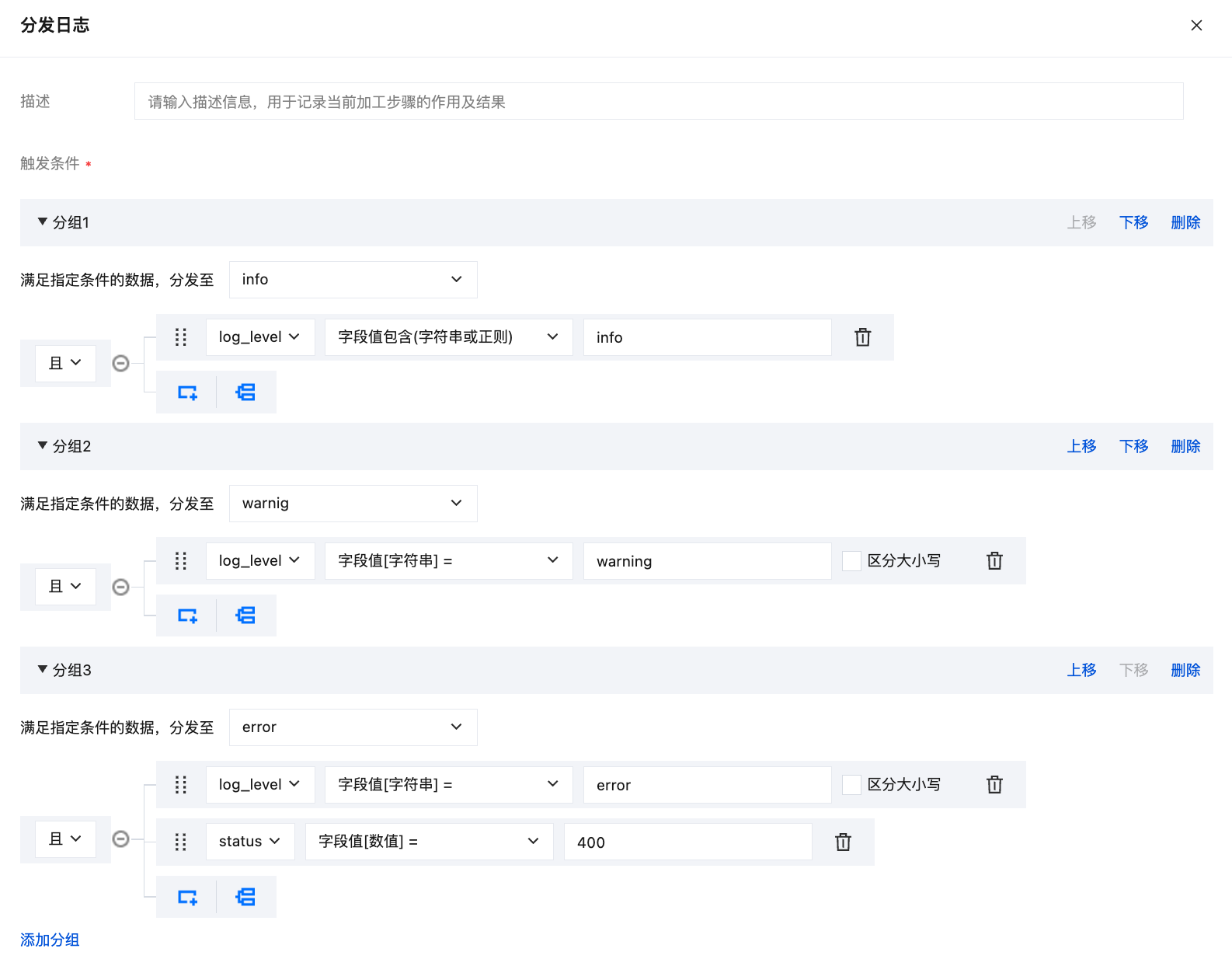 | 分组3 | log_level=" error"且status="400" | 否 | 配置您的分发条件,当日志满足条件时,将会发送到对应的日志主题。例子中是名为 error 的日志主题 |