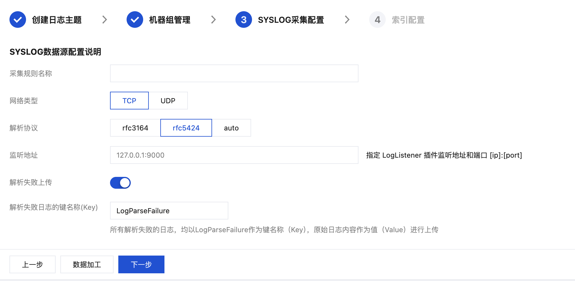 监听地址 | 输入框 | 指定的 Syslog 转发地址和端口,格式为 [ip]:[port]。 采集本地机器场景:配置转发地址为127.0.0.1,端口为任意非知名的空闲端口,例如127.0.0.1:9000。 跨主机采集场景:如您通过 Syslog 转发,可参考 rsyslog 转发配置。 |