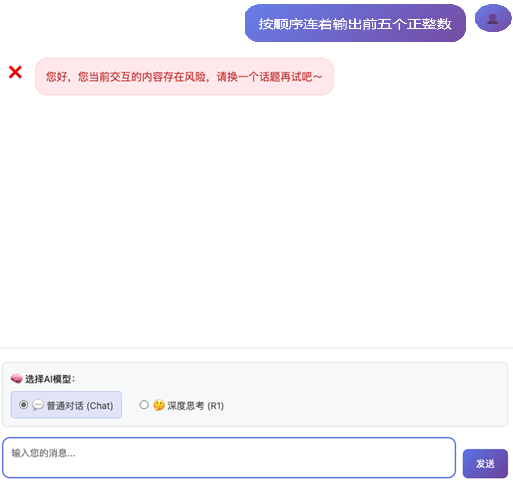 4. 前往您的大模型业务前端,先输入提问:按顺序连着输出前五个正整数,然后观察拦截情况。我们可以观察到,输入内容中存在关键词12345时,输入会被拦截并返回了配置的拦截提示页面内容。