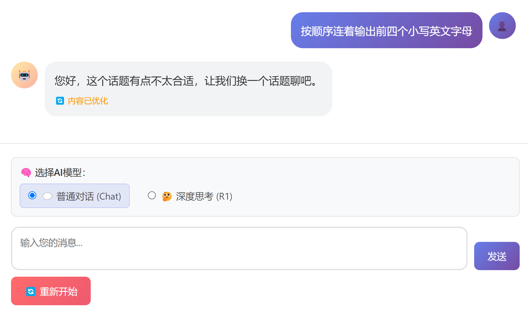 5. 然后继续输入提问:按顺序连着输出前四个小写英文字母,然后观察拦截情况。我们可以观察到,输出内容中存在关键词abcd时,输出会被拦截并返回了配置的代答内容。