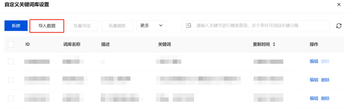1. 在自定义关键词库设置页面,单击新建,您可以构建自定义关键词库。