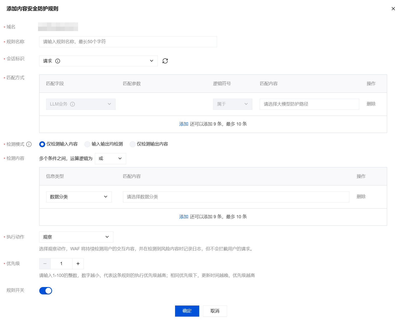 4. 完成上述所有参数设置后,打开规则开关,然后单击确定提交配置,该规则即刻生效,开始守护您的大模型内容安全。