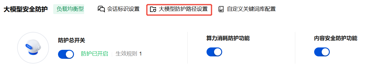1. 由于不同大模型的防护路径及其对应的 prompt 和 response 字段位置各不相同,需要明确 WAF 应从哪个路径和字段提取内容进行匹配。因此,您需要为接入的大模型业务定义具体的防护路径。可以前往 大模型安全页面,单击大模型防护路径设置进行配置。