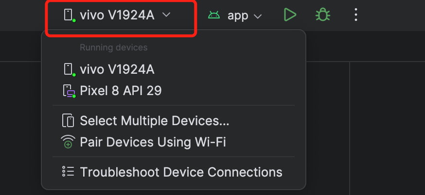 Android Studio 右上角如下图所示处选择您要将 Demo 运行的设备: