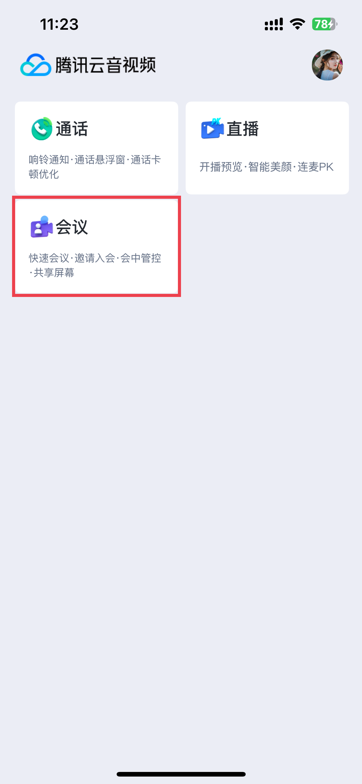 登录成功后主页通过会议功能入口进入 TUIRoomKit Demo 功能页面。