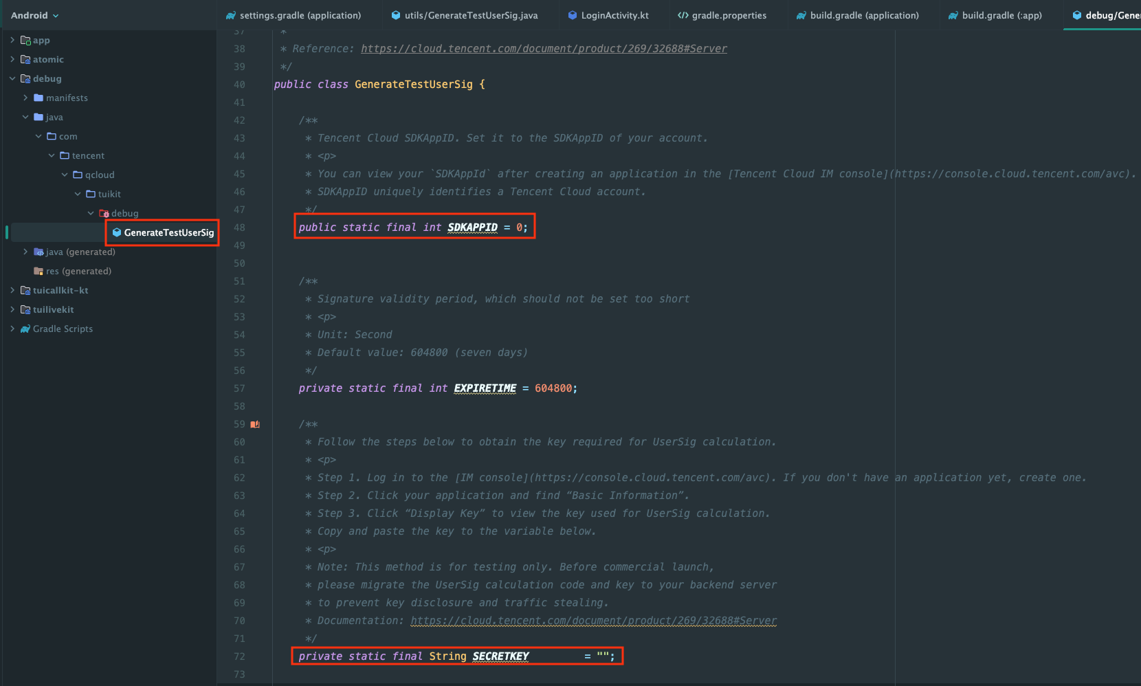 TUIKit_Android/application/debug/src/main/java/com/tencent/qcloud/tuikit/debug/GenerateTestUserSig.java文件,将获取的 SDKAppID 和 SDKSecretKey 填入:
