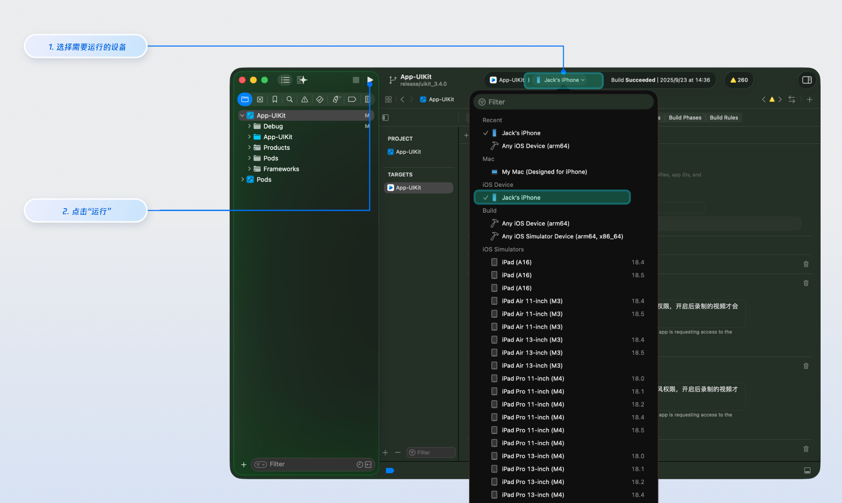 2. 在 Xcode 界面顶部工具栏的 iOS Device 下拉菜单中选择您用来测试的 iOS 设备。