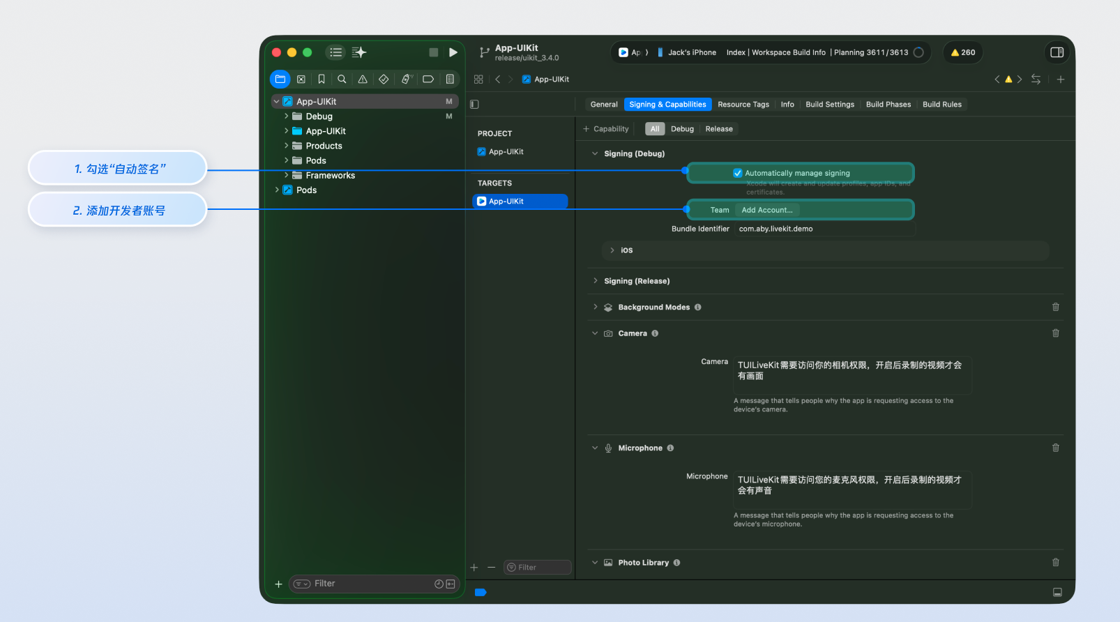 UserSig,在需要 UserSig 时由您的 App 向业务服务器发起请求获取动态 UserSig 来进行鉴权。详见 服务端生成 UserSig。2. 配置苹果开发者签名:在项目 TARGETS 下的 Signing & Capabilities 界面勾选 Automatically manage signing,配置您的苹果开发者账号和 Bundle Identifier:
