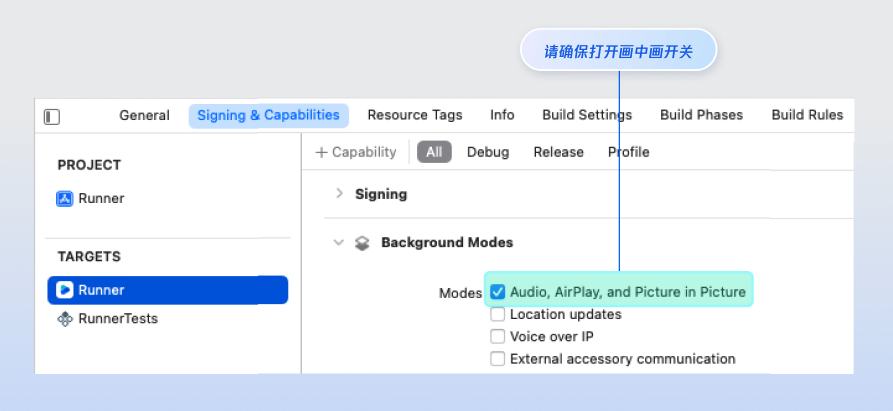 4. (可选)如果您需要接入浮窗版直播页面,需要开启系统画中画特性。