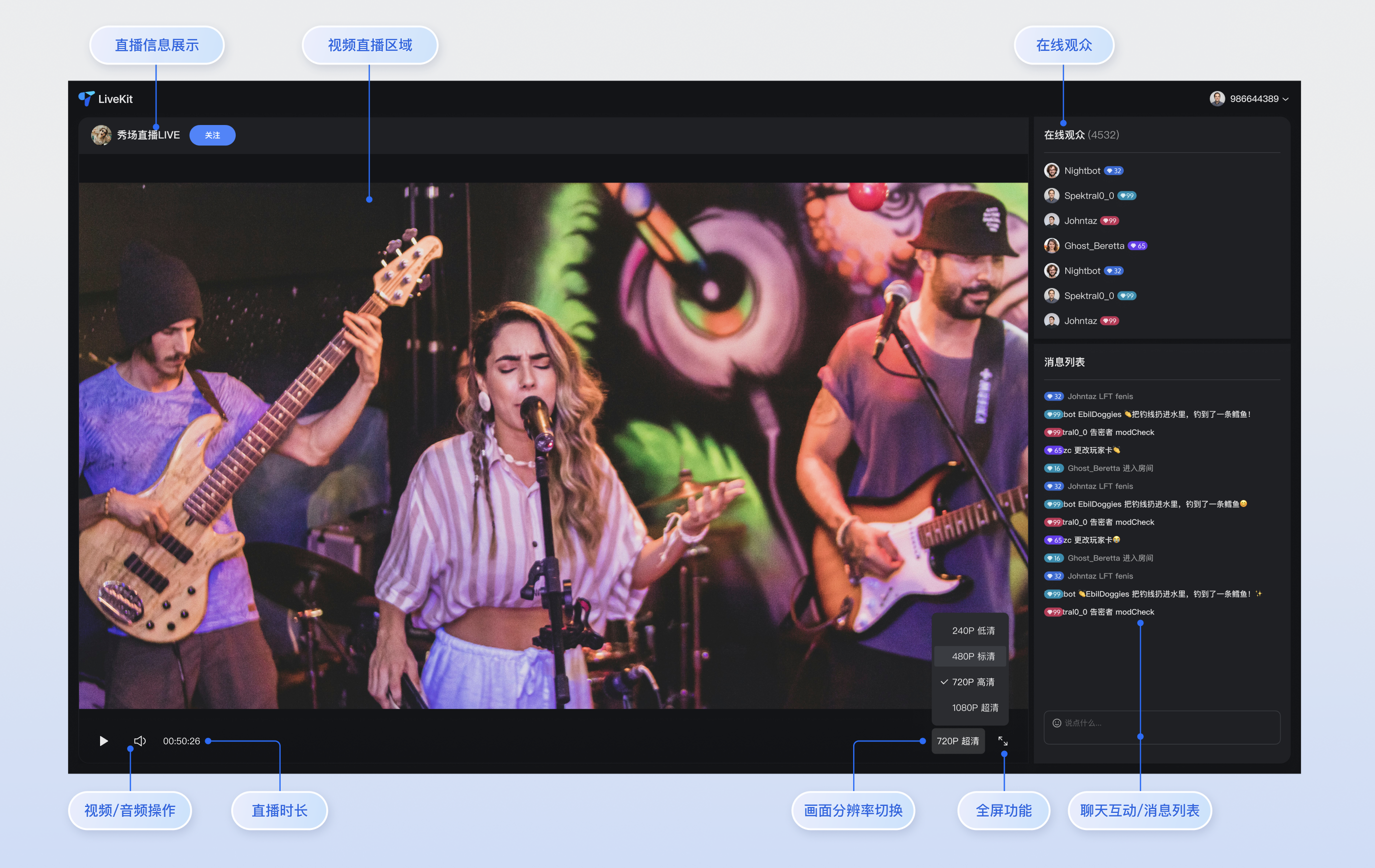 观看页面提供默认行为和风格,但如果默认行为和样式不能完全满足您的需求,您也可以对 UI 进行自定义。图中显示的数字与特定功能列表中的类别相对应。其中主要包含直播信息展示、视频直播区域、在线观众、音视频操作、直播时长、画面分辨率切换、全屏功能、聊天互动、消息列表等。