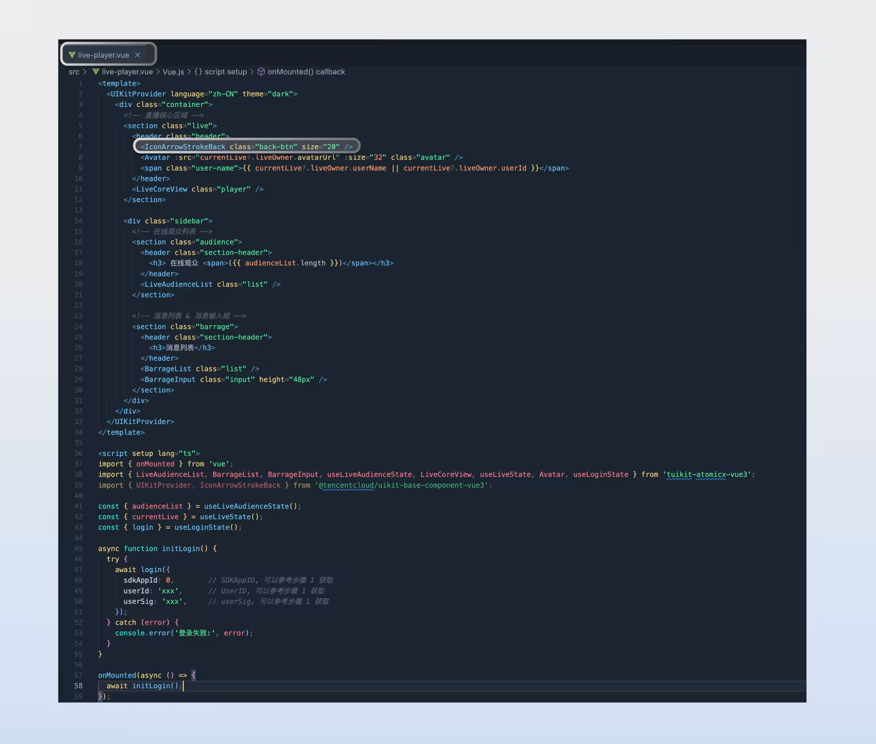 live-player.vue 文件中的按钮和图标为例,您可以参考下图找到对应按钮或图标的指定位置源码,对当前部分的控件进行增加、删除、替换等 UI 定制操作。