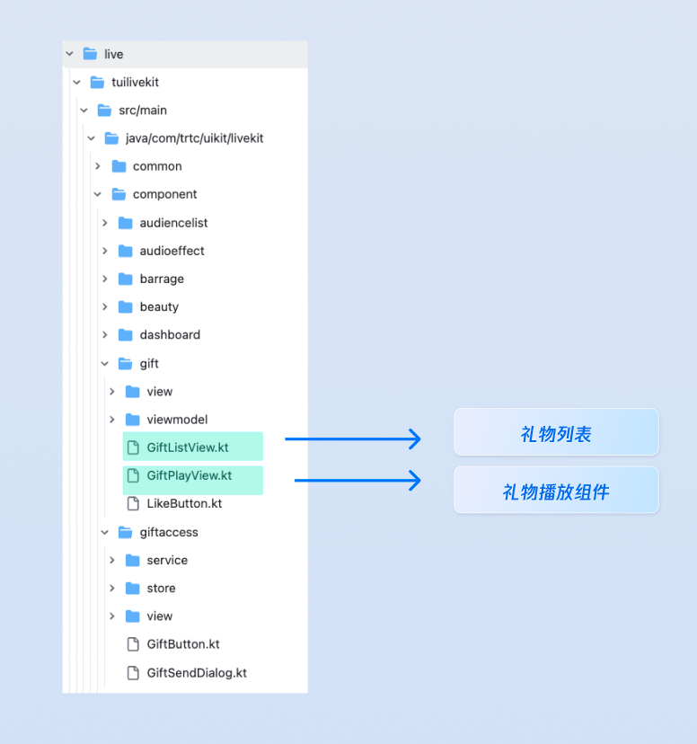 GiftPlayView 是一个透明的覆盖层,用于播放礼物动画。它通常覆盖在视频画面的上方,但位于交互按钮的下方。import android.os.Bundleimport android.widget.FrameLayoutimport androidx.appcompat.app.AppCompatActivityimport com.trtc.uikit.livekit.Rimport com.trtc.uikit.livekit.component.gift.GiftPlayViewclass YourLiveActivity : AppCompatActivity() {override fun onCreate(savedInstanceState: Bundle?) {super.onCreate(savedInstanceState)setContentView(R.layout.activity_live_room)val rootView = findViewById<FrameLayout>(R.id.root_view)// 1. 创建礼物播放组件实例val giftPlayView = GiftPlayView(this)// 2. 初始化组件,传入当前的房间 ID// 组件内部会自动监听该房间的礼物消息并触发播放giftPlayView.init("your_room_id")// 3. 将组件添加到视图层级中// 建议将此 View 添加到视频层之上,UI 控件层之下rootView.addView(giftPlayView)}}