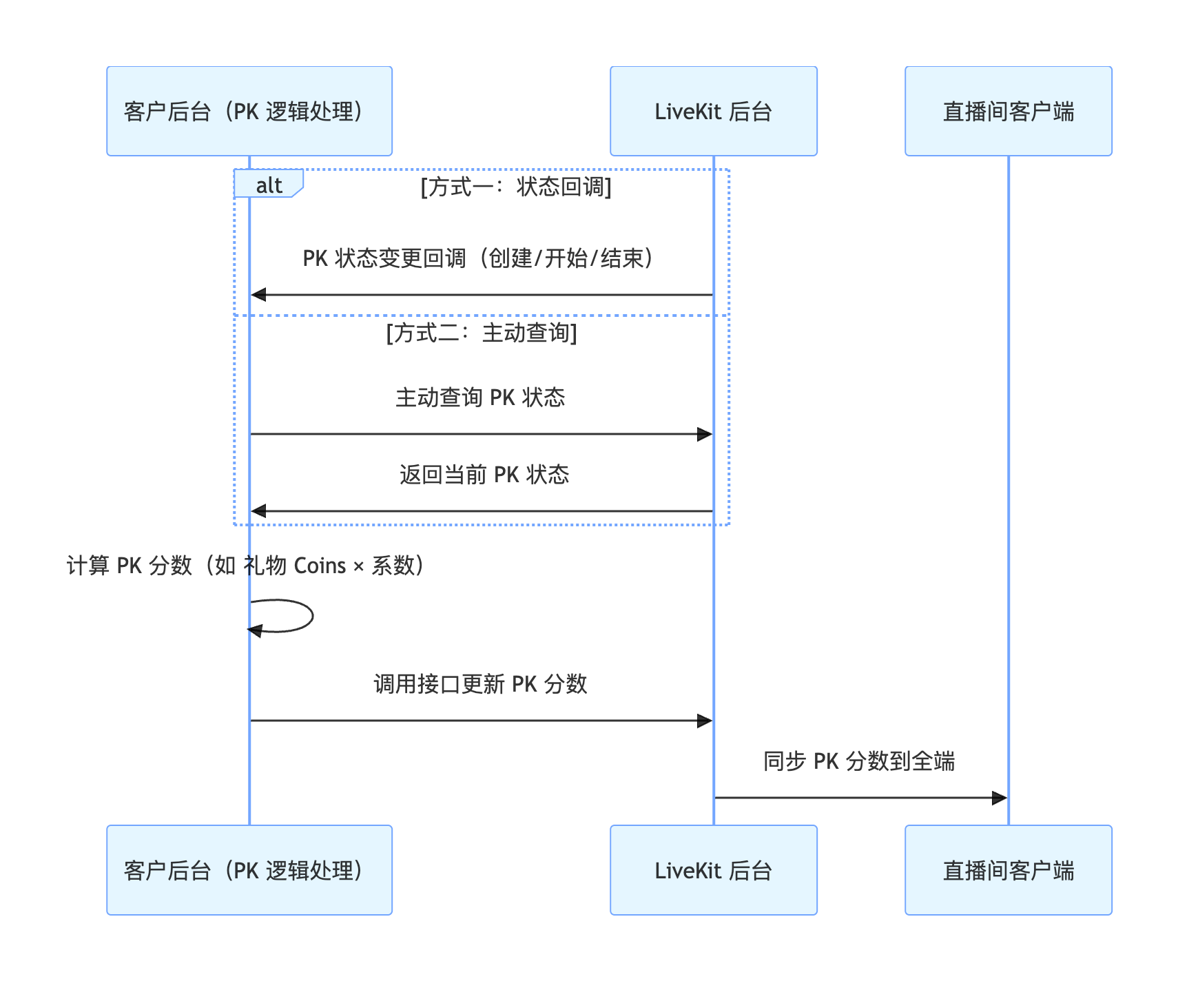 主动查询:您的后台服务可主动调用 PK 状态查询 接口,随时查询当前 PK 状态。
