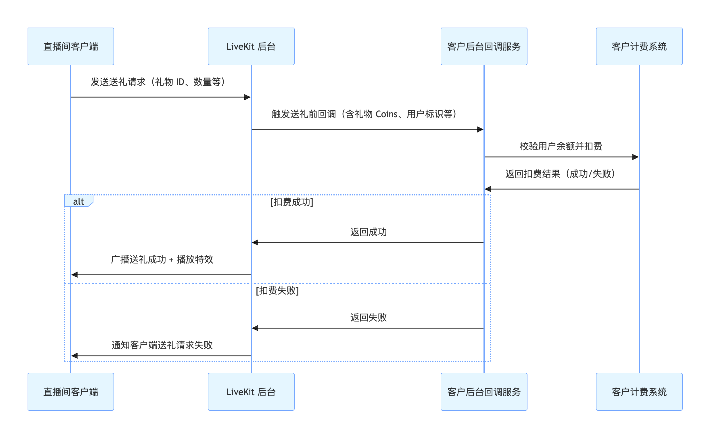 礼物扣费回调:与您的计费系统无缝对接,完成余额校验和扣费流程。