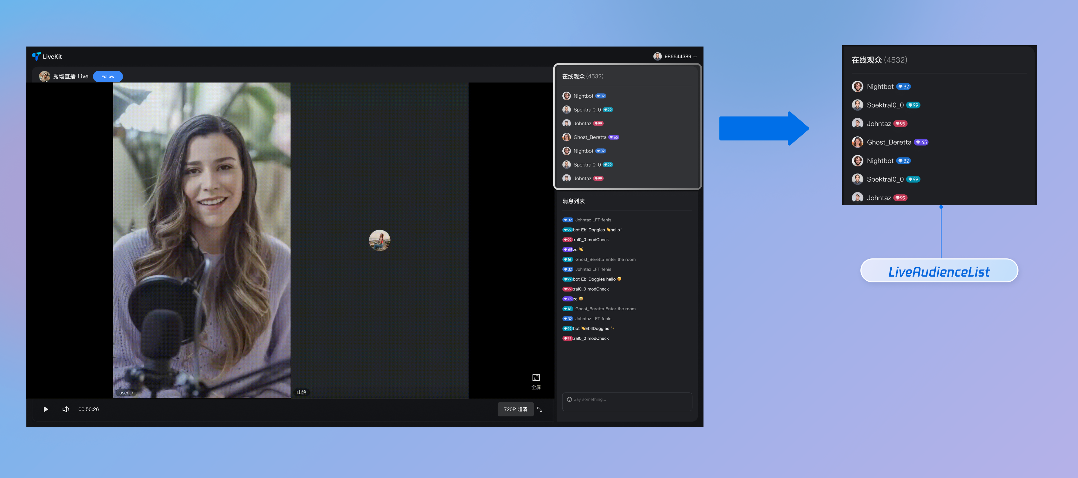 观众动态监听:通过事件订阅,实时感知观众的加入和离开。