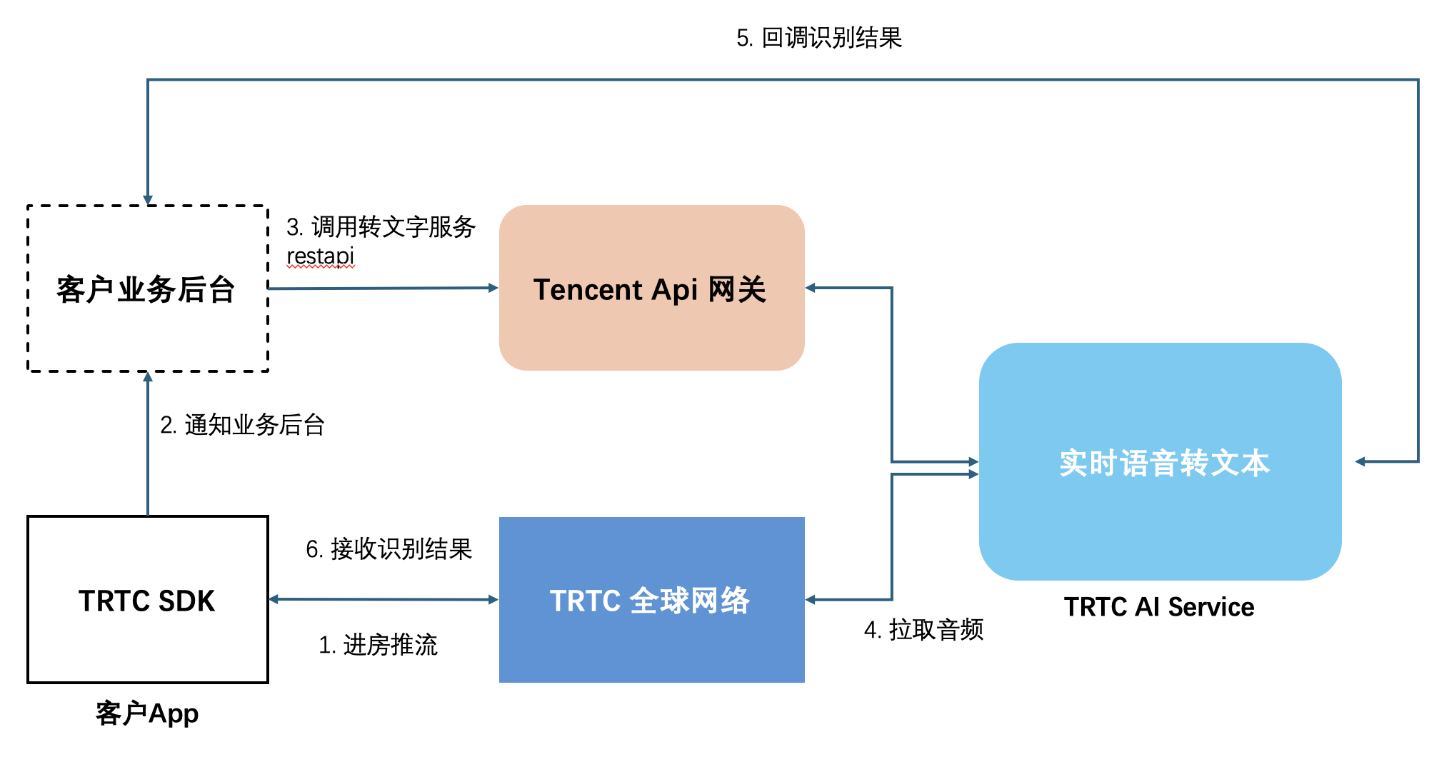 任务发起后,TRTC AI Service 通过识别机器人进入 TRTC 房间拉流指定用户或所有用户的流,进行语音转文字识别,将识别结果实时回调给客户端和服务端。