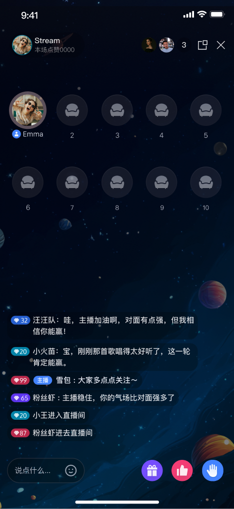 TUILiveKit 语聊房为纯音频直播场景提供了开箱即用的全功能界面。它支持快速搭建观众观看、上麦互动所需的核心能力,让您无需关注复杂的 UI 与麦位管理逻辑。功能概览