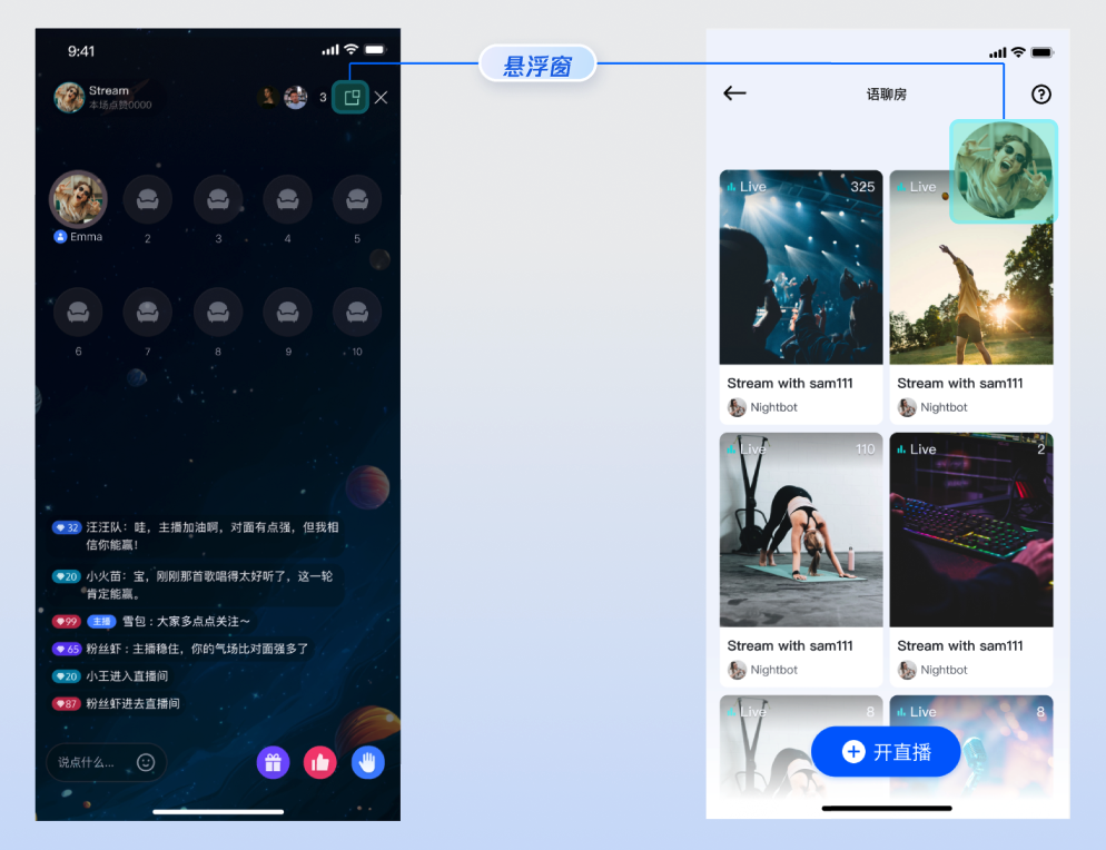 收听直播 | 上麦互动 | 直播间信息 | 观众互动 |