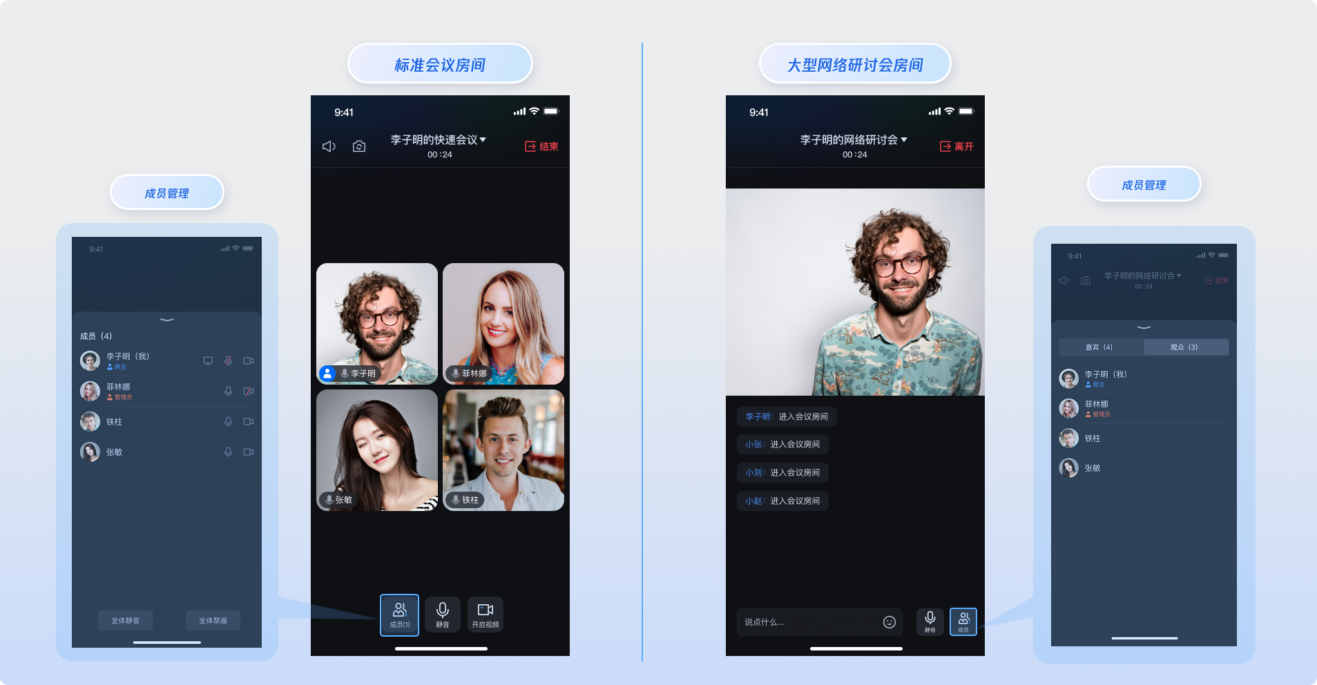 适用场景:小型会议、团队协作、朋友聊天等。 成员特点:所有成员都是参与者,可以自由开启/关闭音视频设备。 管理特点:扁平化管理,房主可设置管理员进行协助管理。 | 适用场景:网络研讨会、在线培训等。 成员特点: 嘉宾(Participants):可以开启音视频设备,参与互动。 观众(Audience):只能观看,无法开启音视频设备。 管理特点:分层管理,支持观众与嘉宾身份转换。 |