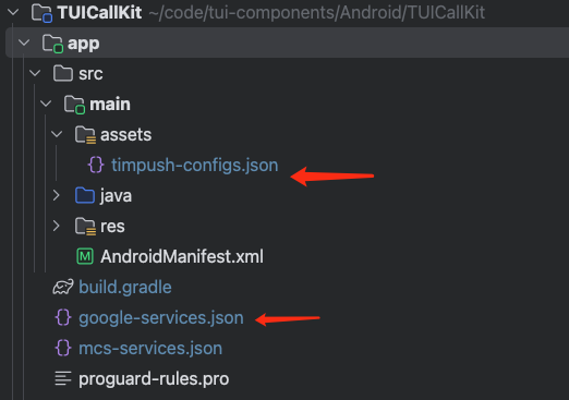 timpush-configs.json 文件添加到应用模块的 assets 目录下,将 google-services.json 添加到工程 app 目录下。选择下载配置文件 timpush-configs.json | 下载文件 google-services.json | 添加到您的工程 |